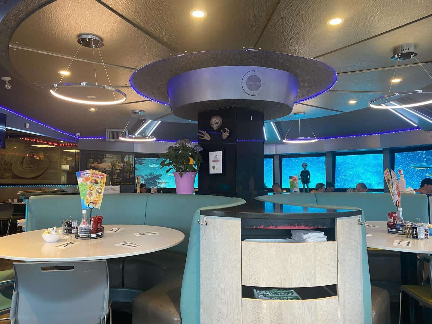 They’re known for their breakfast, with options on the menu like an E.T. Special with pancakes, eggs, sausage, bacon, home fries and toast. For dinner, they’ve got a Stardust Medley stir fry, Universal Sandwich Space Platters, and Starship Subs, and their wine and beer is listed under “Rocket Fuel.”