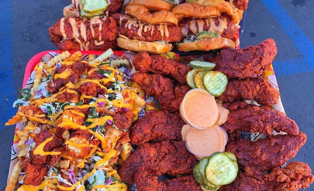 The menu consists of breaded chicken with various degrees of spice, fried chicken tenders, sliders and sandwiches, all usually served with sides of fries, mac n’ cheese and pickles.