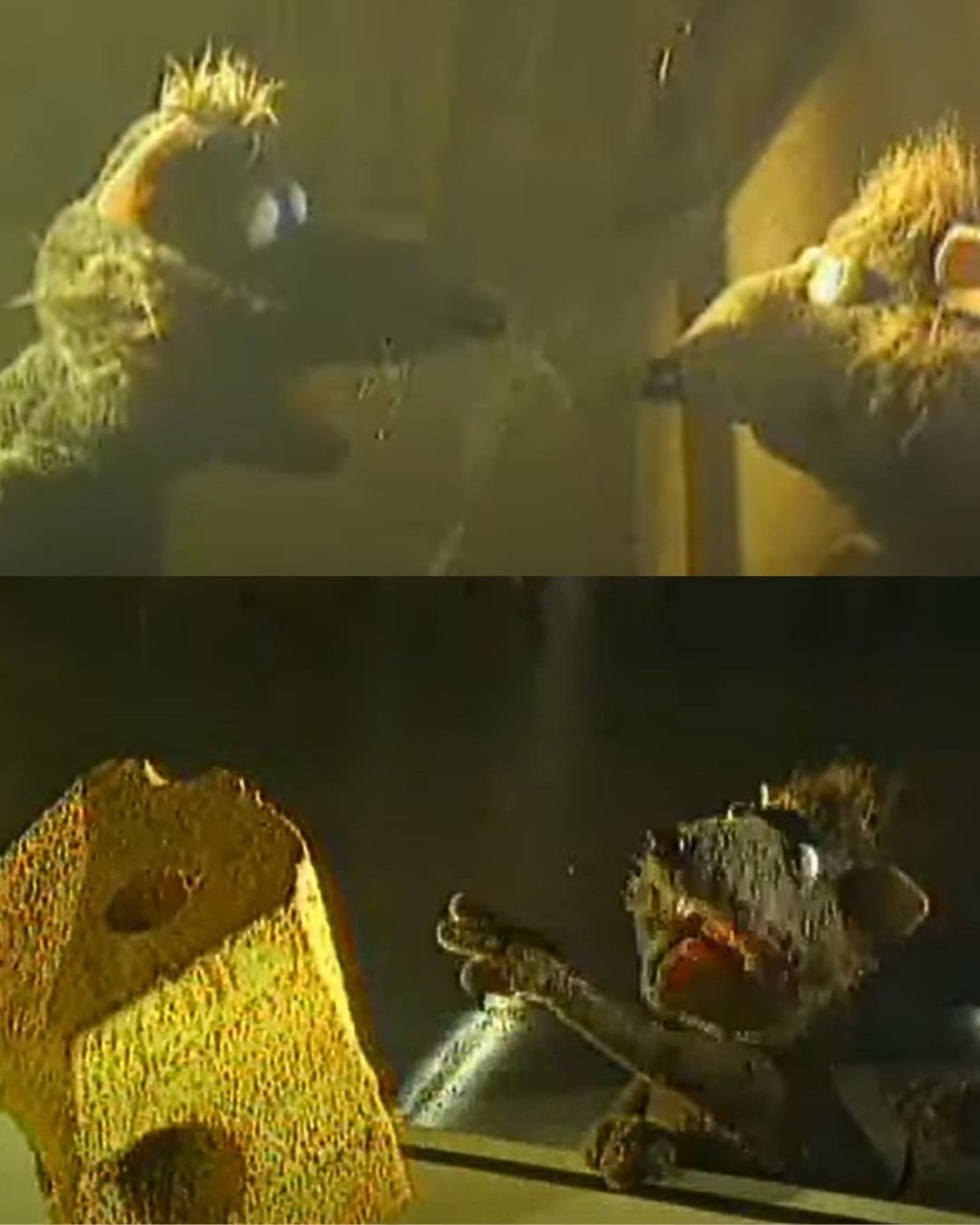 Two puppet mice come across a cheese-laden mousetrap. One mouse urges the other not to touch it, explaining the danger. The PSA uses a simple setup to promote critical thinking and the importance of asking for help when something seems unfamiliar or suspicious.