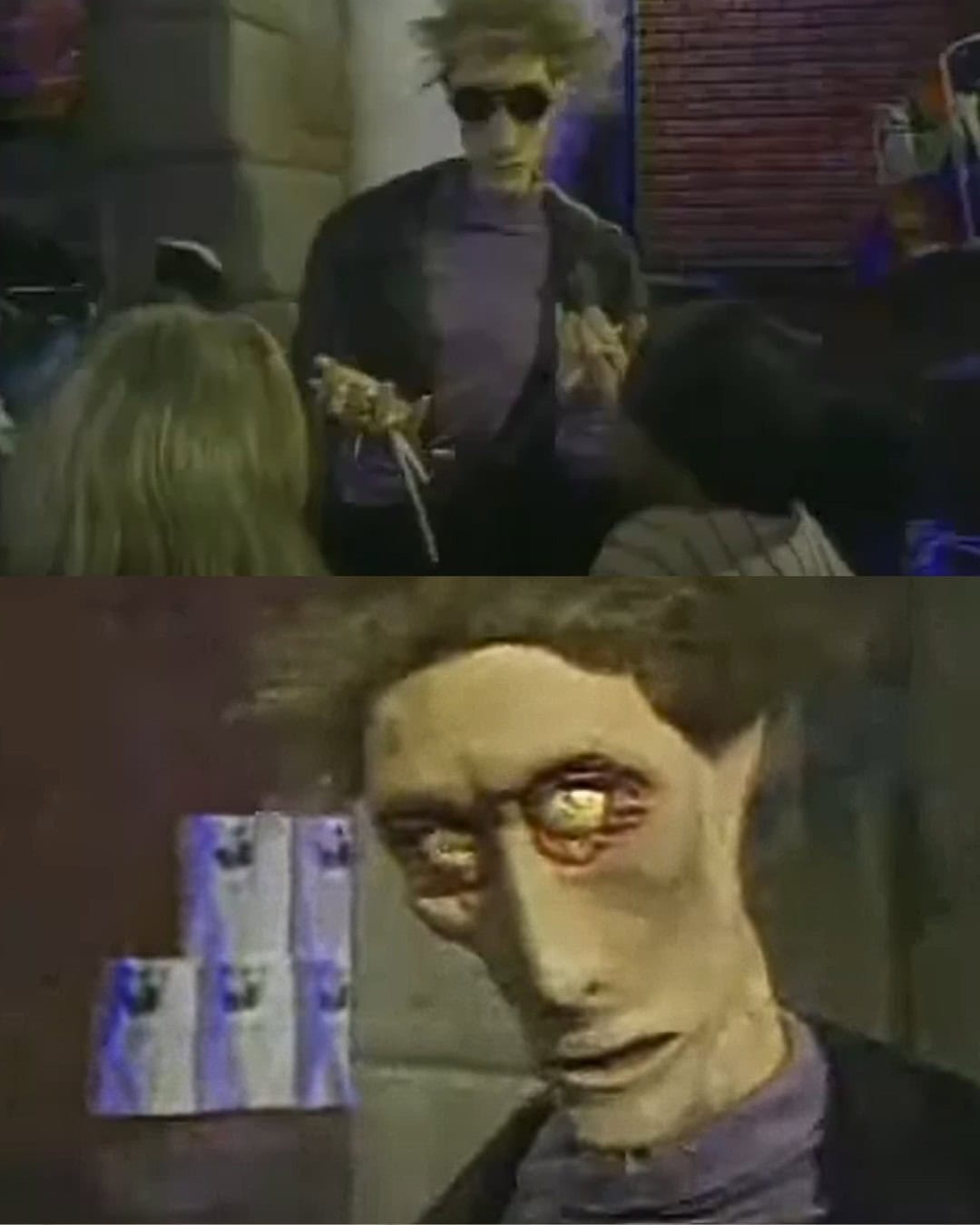In the original, after the kids reject the offer, the man removes his sunglasses to reveal eerie, glowing yellow eyes as ominous music plays. This version was eventually pulled after parents complained it was too frightening for children.