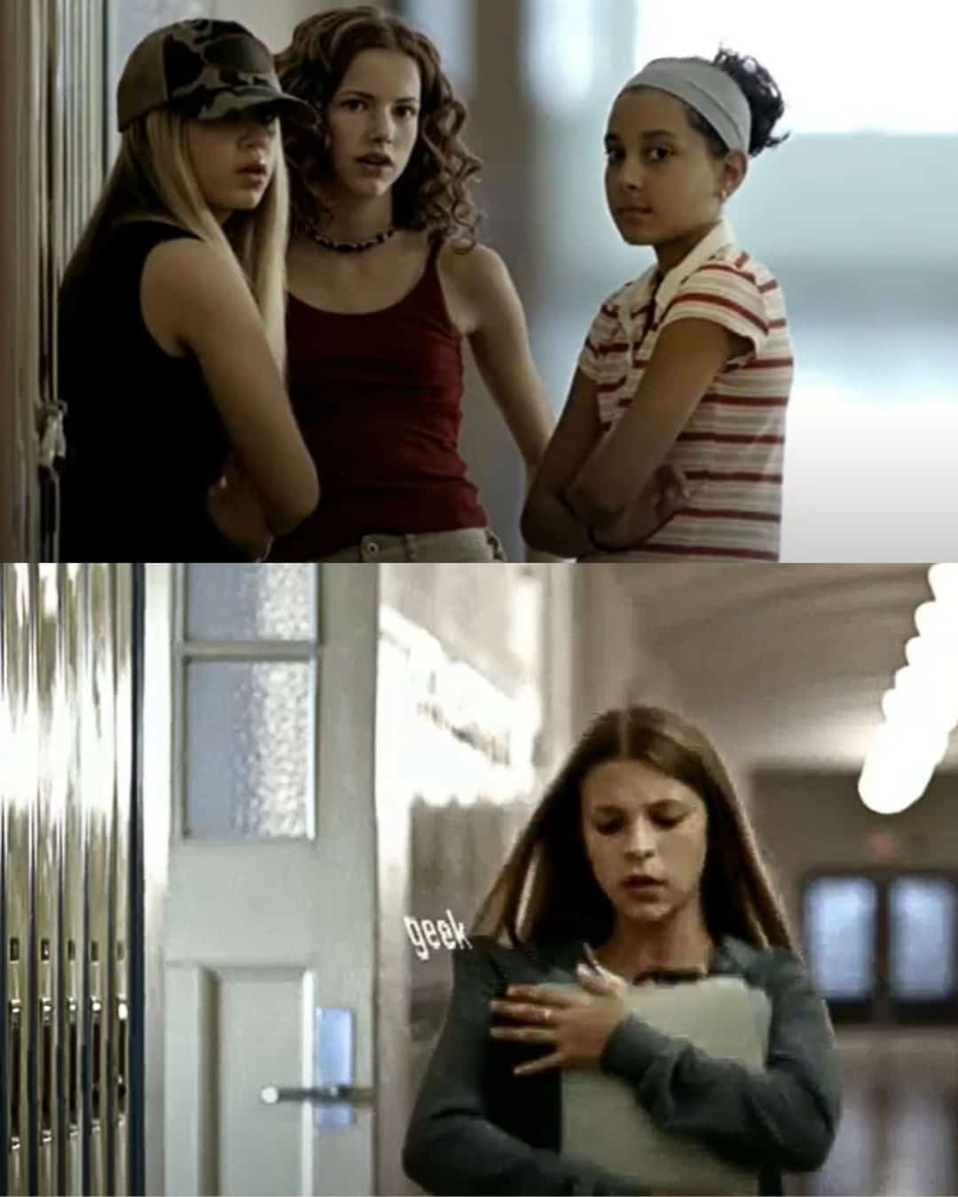 A girl pauses to get a drink at a school fountain before overhearing classmates whispering behind her. The insults literally turn into physical projectiles, chasing and attacking her as she runs.