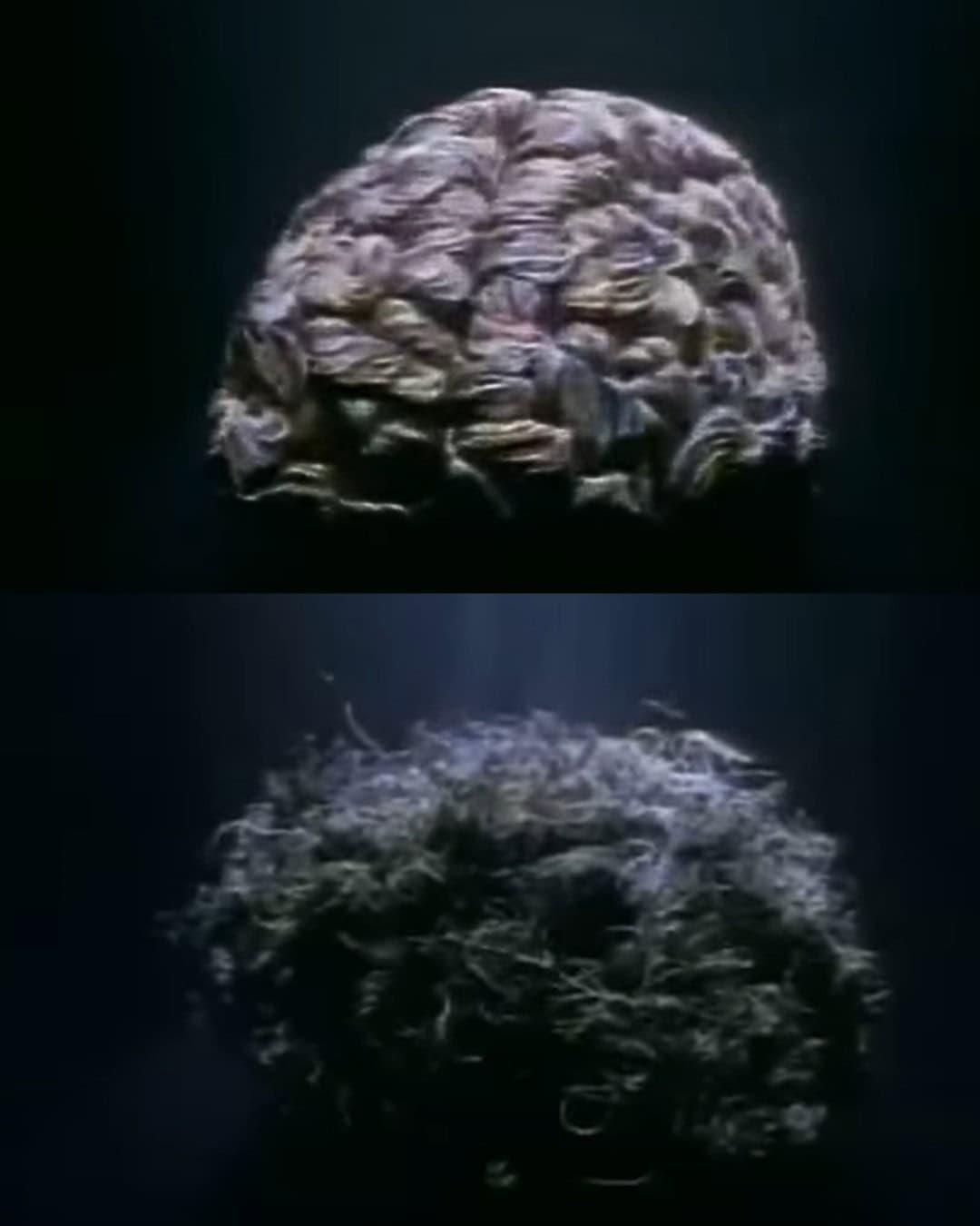 A brain made entirely of electrical wires lights up and pulses, until a hand starts snipping wires, causing it to short-circuit. A firm woman’s voice narrates a warning: “Think about it while you still can.” A chilling early message about how drugs affect the mind.