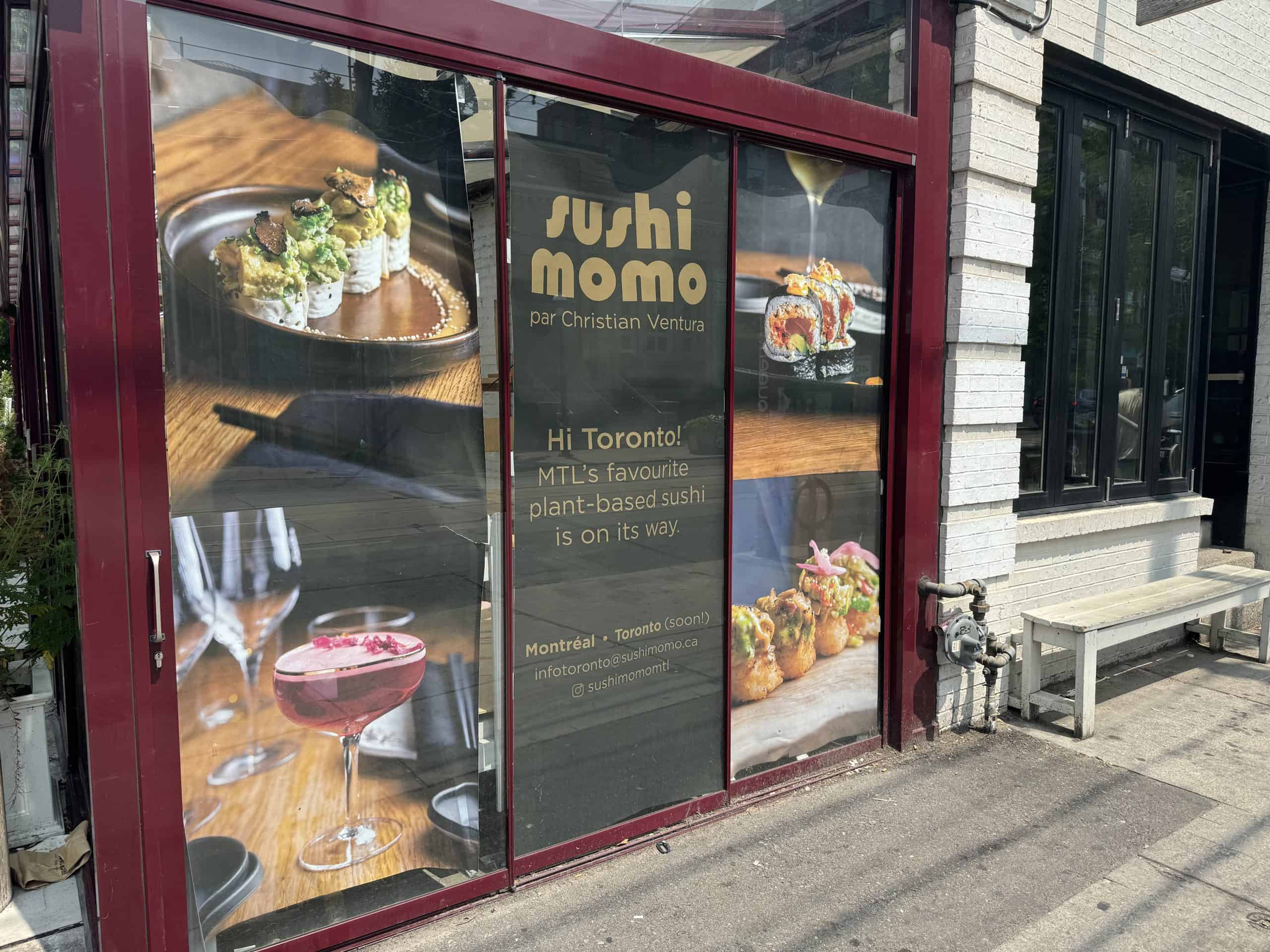 Signage is now up for the new Sushi Momo location in Toronto at 1122 Queen St. W. where another plant-based restaurant, Hello 123, used to be.