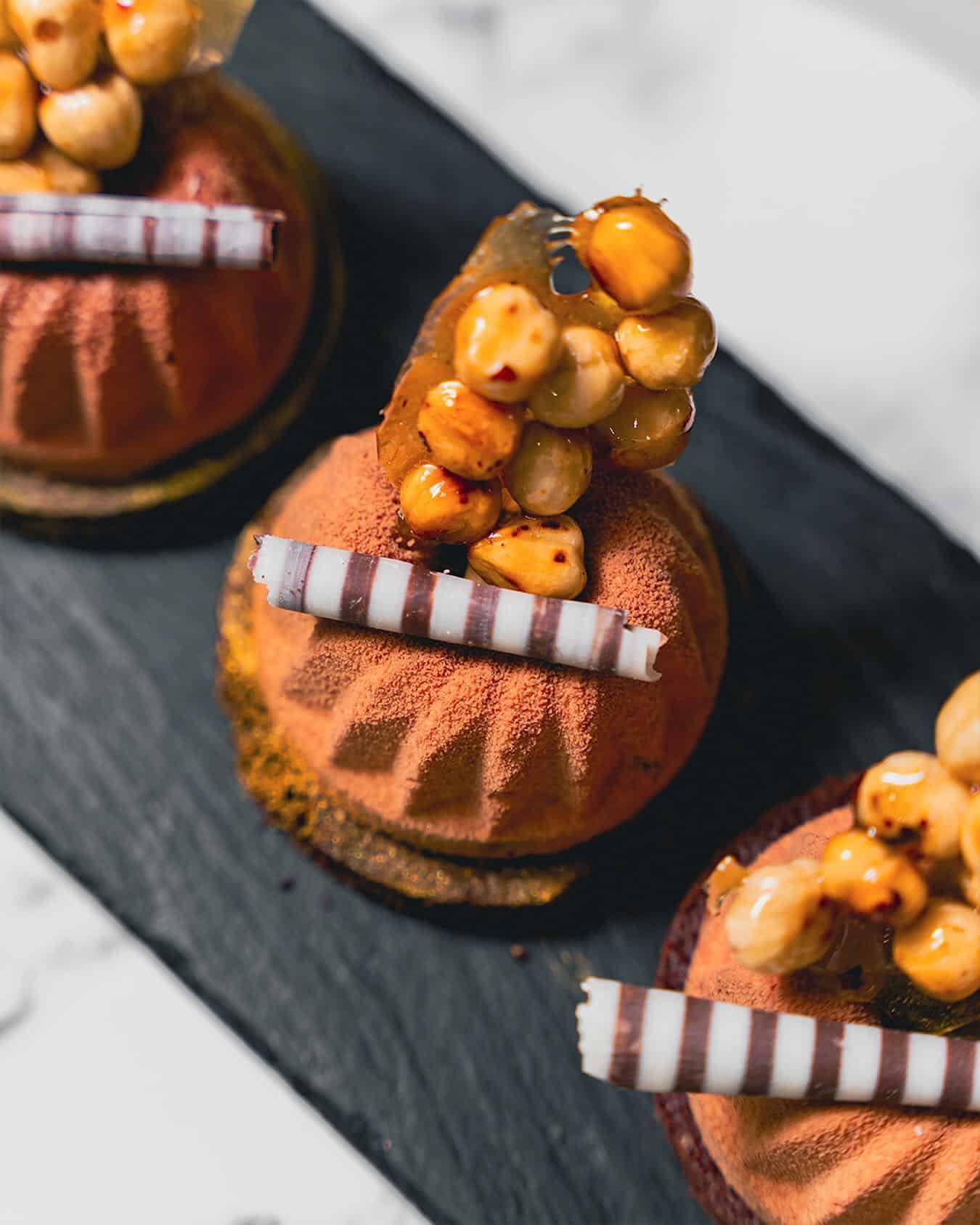 When it comes to those fancy pastries, there’s the Black Forest 2.0 with Morello Cherry jelly, chocolate sponge and dark chocolate creme anglaise, decorated with fresh cherries and gold leaf. They also have the Tropical Delight, made with coconut dacquoise, vanilla sponge and passion fruit rum coconut mousse, finished with plain sable, passion fruit seeds and a tuile leaf. The Peach Champagne combines red velvet cake with peach compote and a touch of champagne.