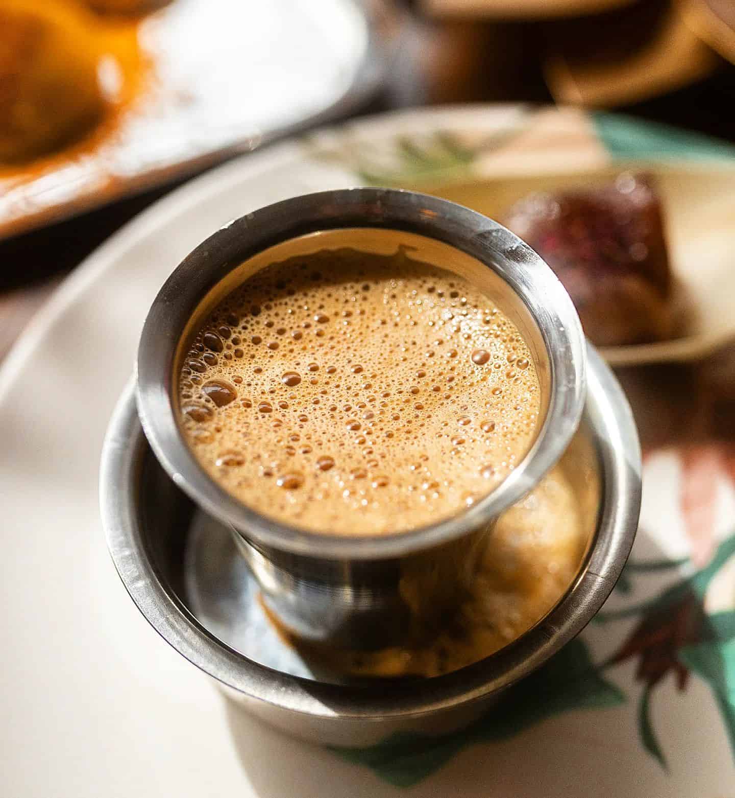 Madras Kaapi makes South Indian coffee, or kaapi. It’s served with a visually impressive pouring process that produces a frothy drink.
