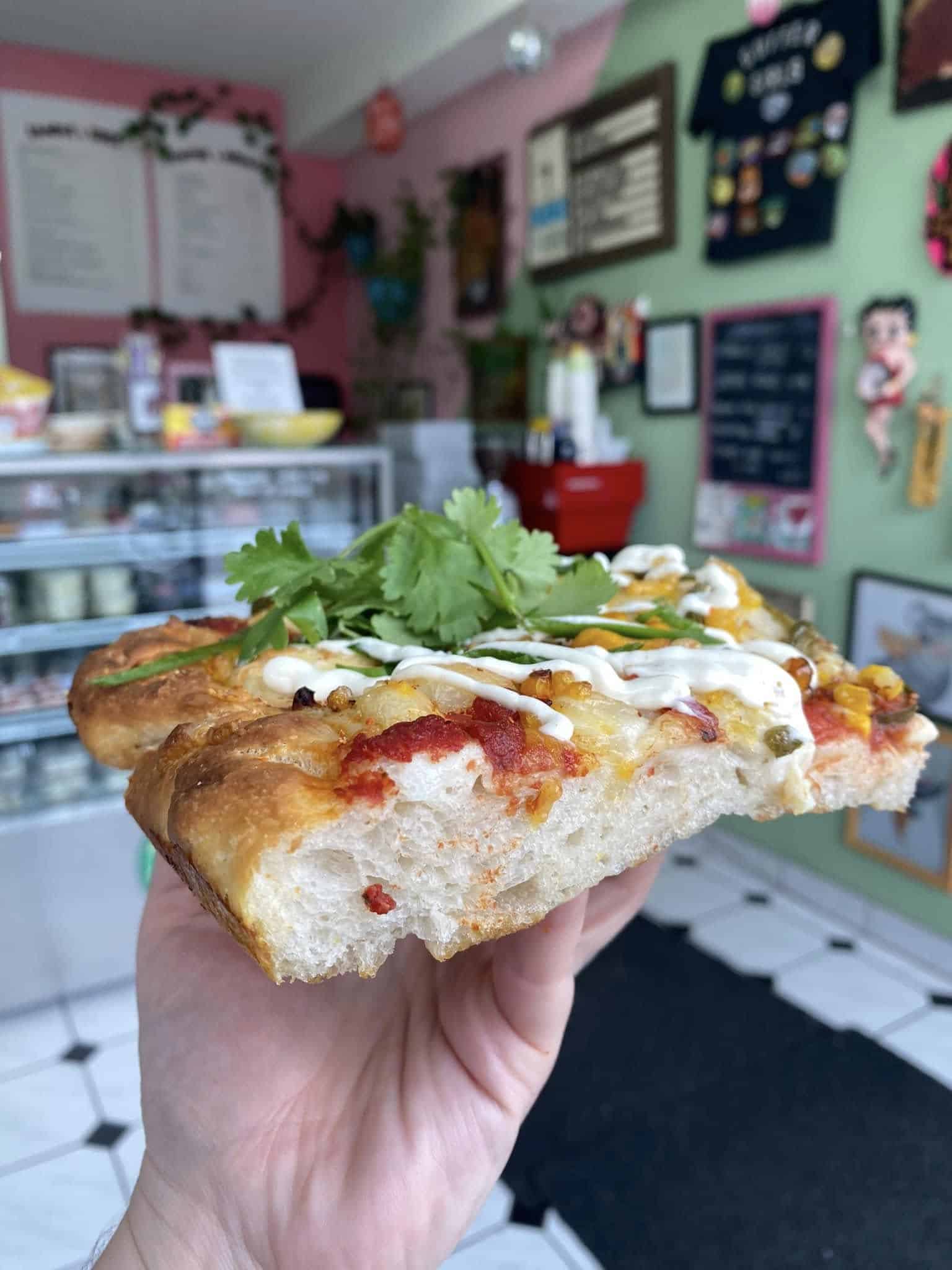 Aunty Em’s Deli has been known as a destination for vegan food, and also exists as a pop-up and catering entity and sells vegan hot dogs as Sausage Party. They’ve also been making vegan pizzas for sale at the shop and pop-ups.