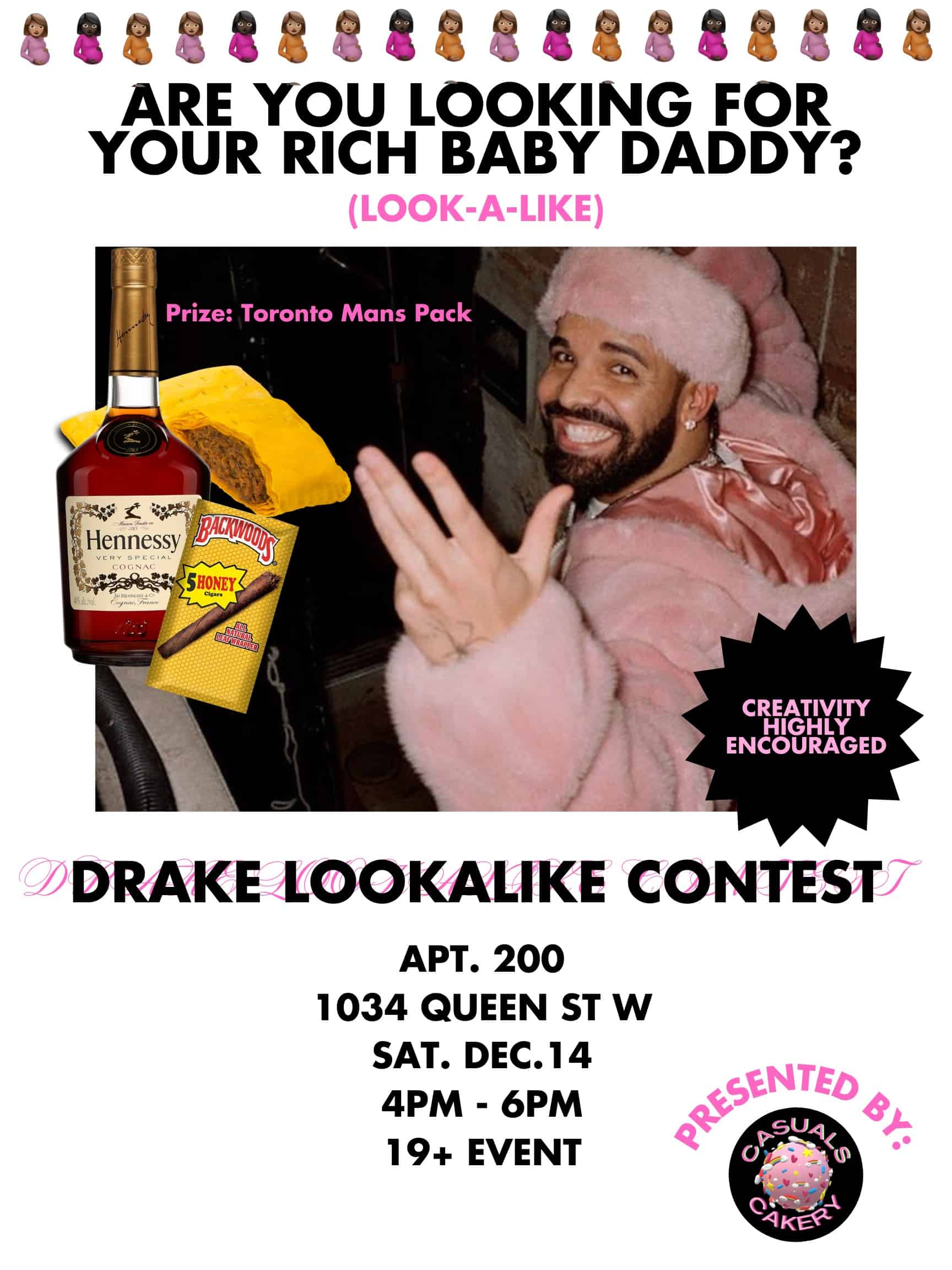 The Drake Era’s Lookalike Contest is slated to take place at Apt 200 (1034 Queet St. W.) on Dec. 14 at 4 p.m. While organizers had initially promised a “Toronto Mans” prize pack with a bottle of Hennessy, a pack of backwoods and “other surprises,” the man of the hour recently decided to shake things up by offering to reward the winner with $10,000.
