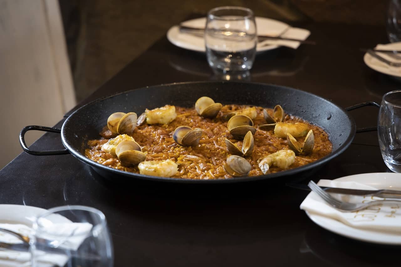 - Pescado y mariscos: Shrimp, monkfish, clams, squid, bomba rice and saffron. This traditional paella dish features a variety of seafood; offering layers of rich, smoky flavour profiles made with ingredients imported from Spain.