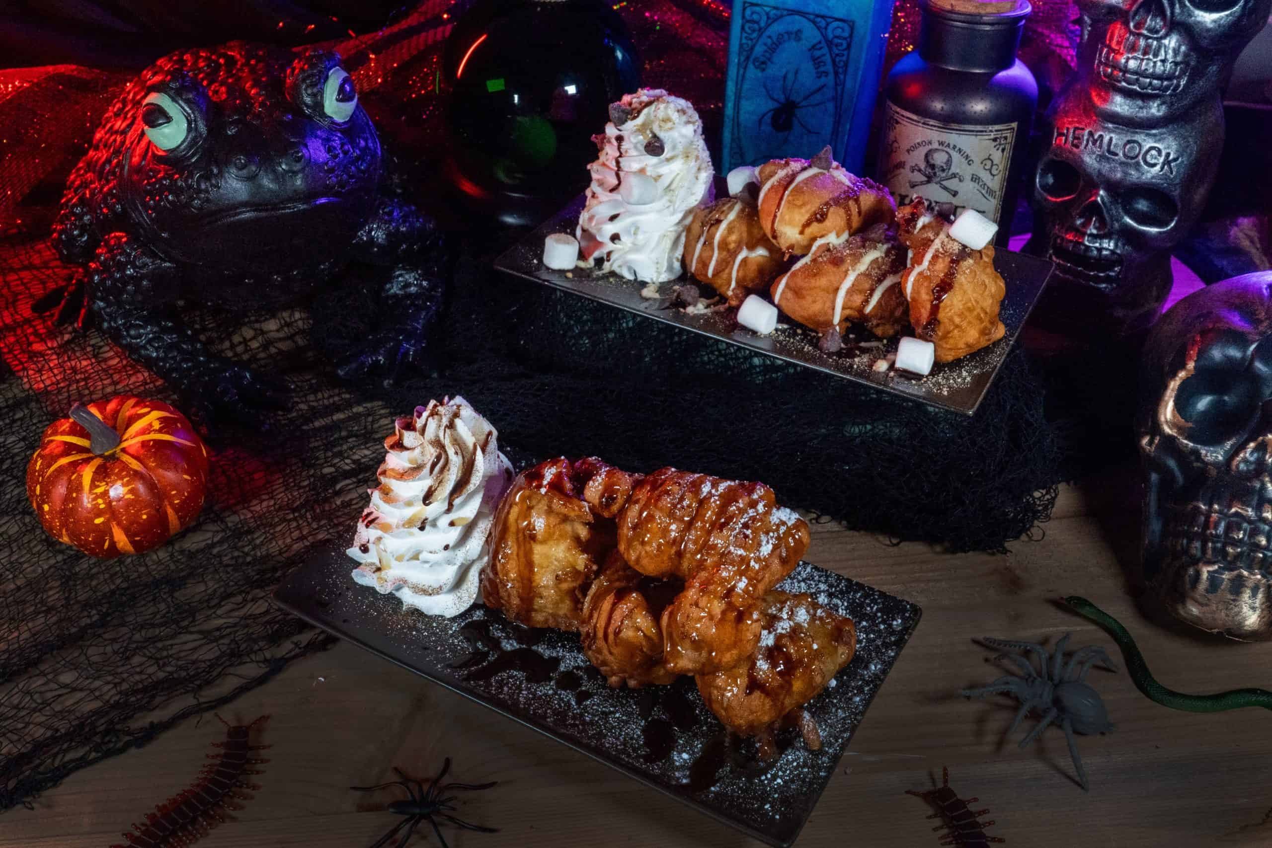 There are desserts other than the Zombie Apple Fritters served with vanilla ice cream, too: there will also be Dirt and Worms Funnel Cake topped with chocolate sauce, Oreo crumbles, and gummy worms, and the Graveyard Parfait that tops chocolate pudding with gummy worms.