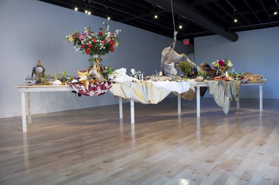 Main image: Emily Jan. After the Hunt, 2017. Hand-felted textiles and mixed media installation in the Inc.’s Cannon gallery. Photo by: Kristina Durka.