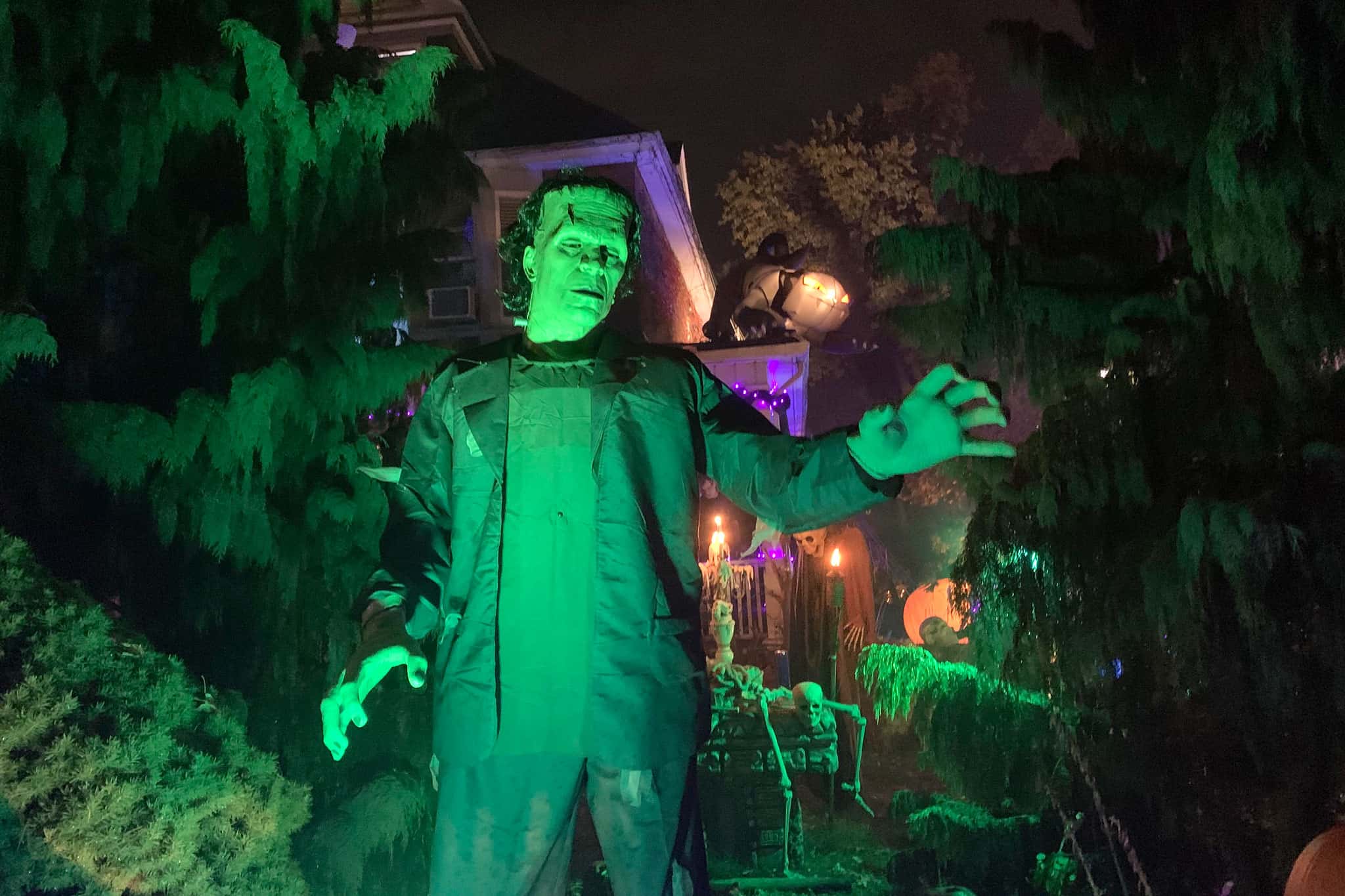 For many years, the homeowners have filled their corner lot yard with skeletons, pumpkins, monsters, creepy spiders and a lot more. Make sure to look up at the skeleton perched at the highest point on the roof.