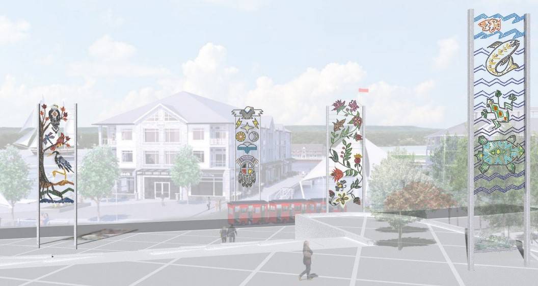 The piece consists of five, 40-foot tall works made of steel and glass. Each piece uses 10,000 handmade glass beads created by local craftsperson Paull Rodrigue, that depict Indigenous culture, water, wildlife and the natural world.