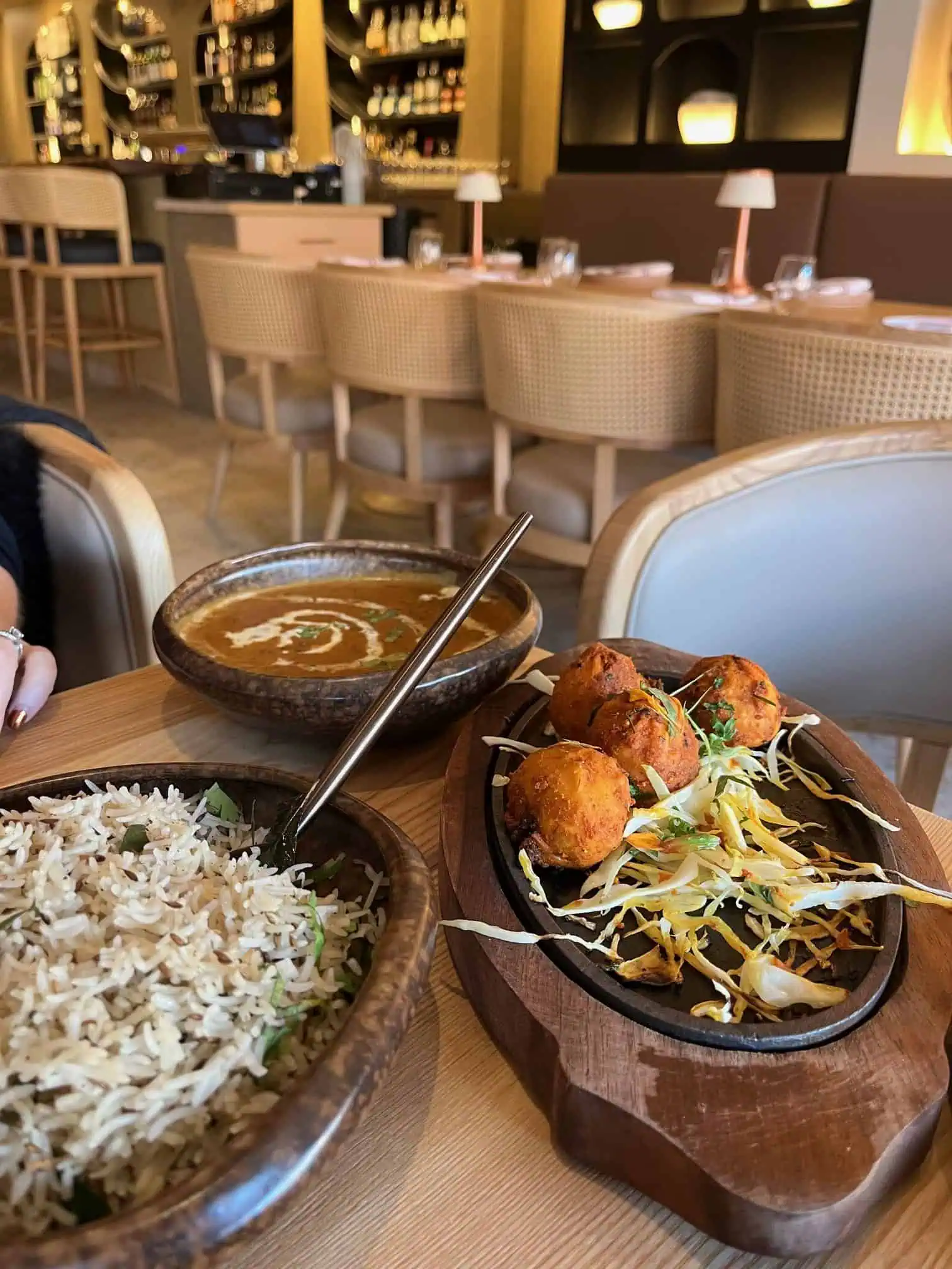 Now, Dhoom, not quite boasting the eye-watering price points of its bougier contemporaries, still puts luxury front and centre with chic decor, heavy porcelain plates and copper-hued cutlery.
