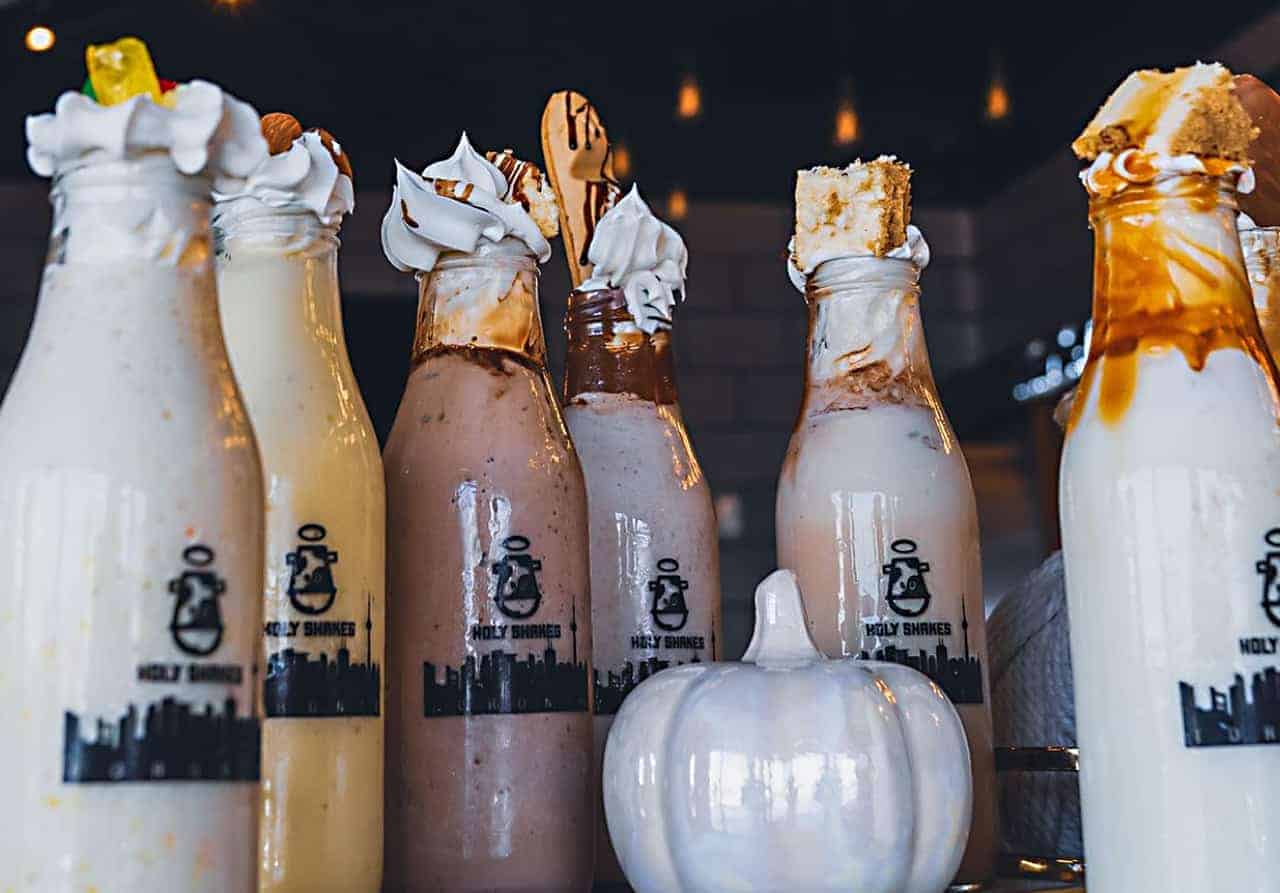 The chain is known for their gourmet fusion milkshakes served in retro glass milk bottles and shakes decadently topped with cake and cookies.