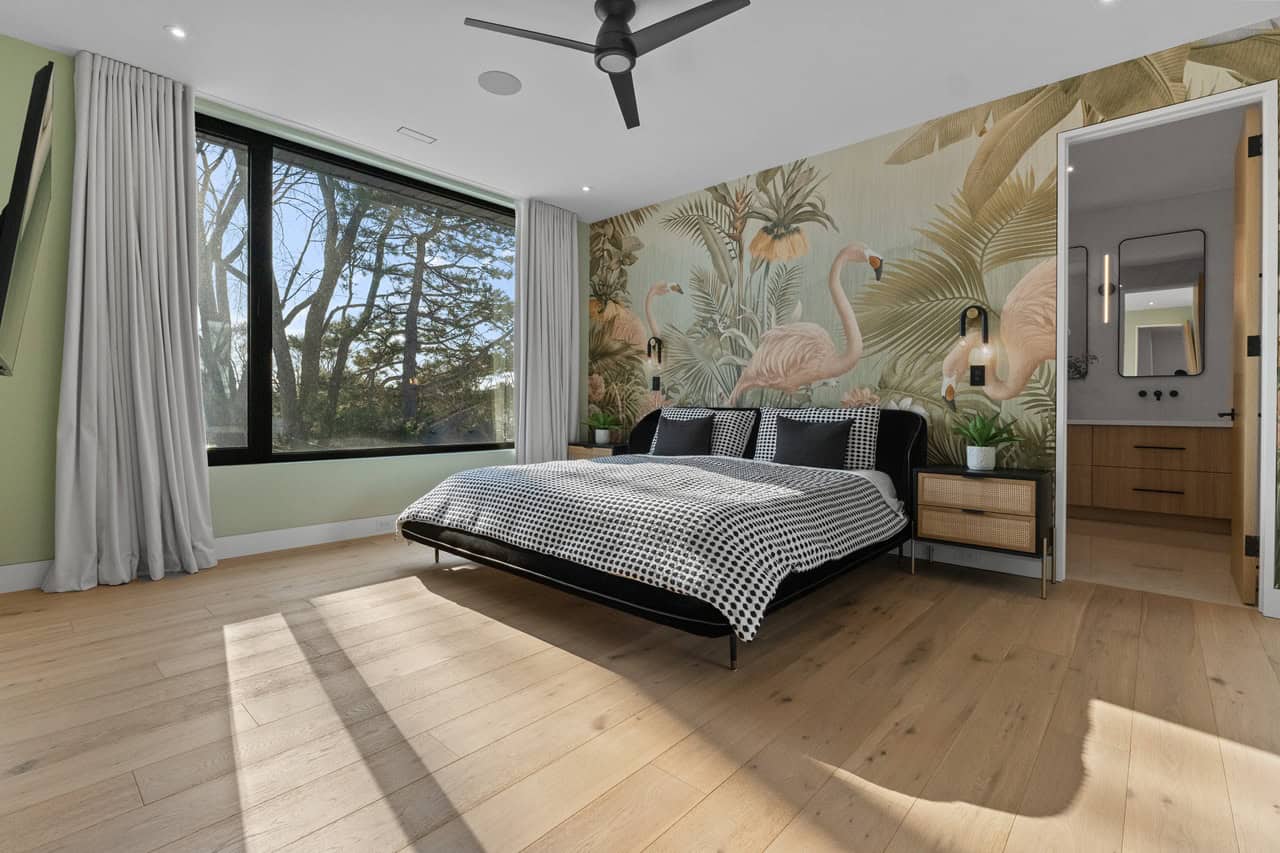 Take the elegant white oak staircase up to the second floor and get a glimpse of the four upstairs suites, including the primary suite with beautiful décor and ample closet space.