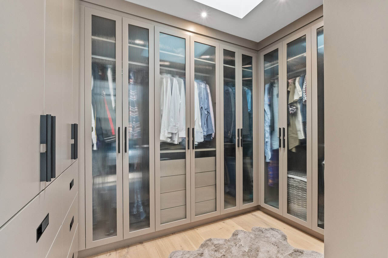 The kitchen serves as the centerpiece of this home, featuring a curved oversized island and hood vent clad in rift cut white oak, matte porcelain backsplash, and premium panelled appliances offering unparalleled functionality.