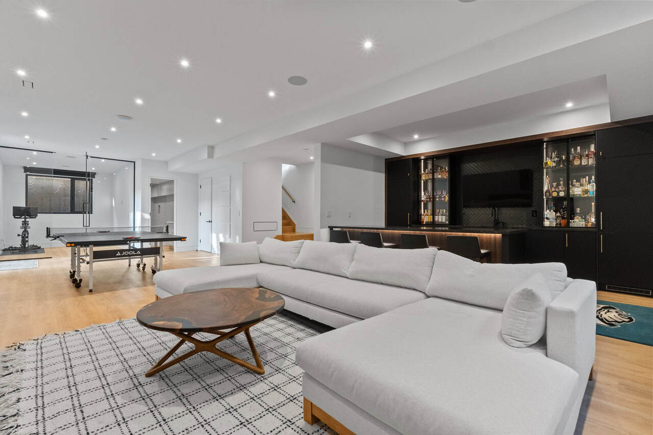 The home’s spaciousness and amenities are further complimented by the fully finished lower level. Versatile and well suited for entertaining, this level features an additional bedroom with ensuite, glass-enclosed gym, rec room, custom wet bar, steam shower, and walk-up access to the backyard.