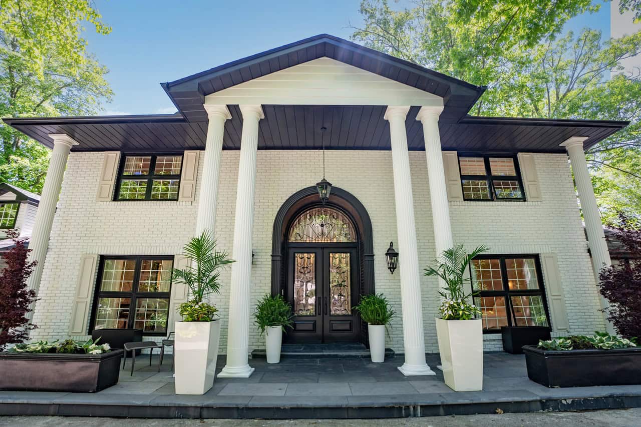 Nestled in Mississauga’s prestigious neighbourhood of Lorne Park, this house makes a brilliant first impression with its Georgian-style design that incorporates gorgeous white bricks, columns and greenery decorating the front entrance.