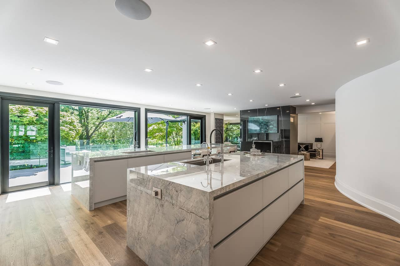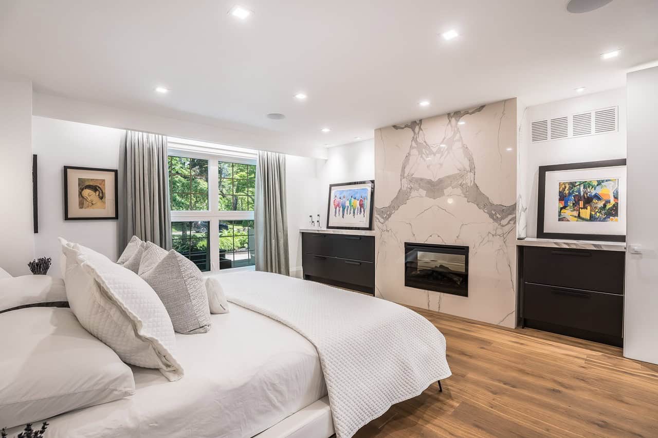 The stunning design continues inside, where the meticulously redesigned interior uses only the finest materials including White Austrian oak hardwood floors, smooth ceilings with LED pot lights, a suite of Legrand residential switches, custom crown moulding and wainscotting, rear Pella windows, and multiple stone fireplaces throughout the home.