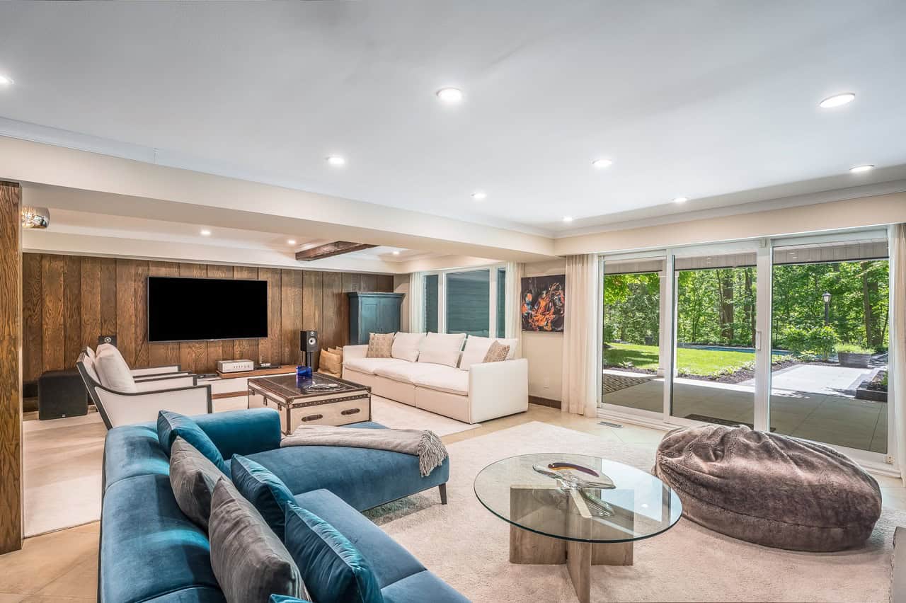 The lower level is the perfect place for leisurely living and entertaining guests, with multiple walkouts to the rear garden, family room with a large wet bar, exercise room, sauna and three-piece bath, games room with snooker/billiards table, and several storage areas.
