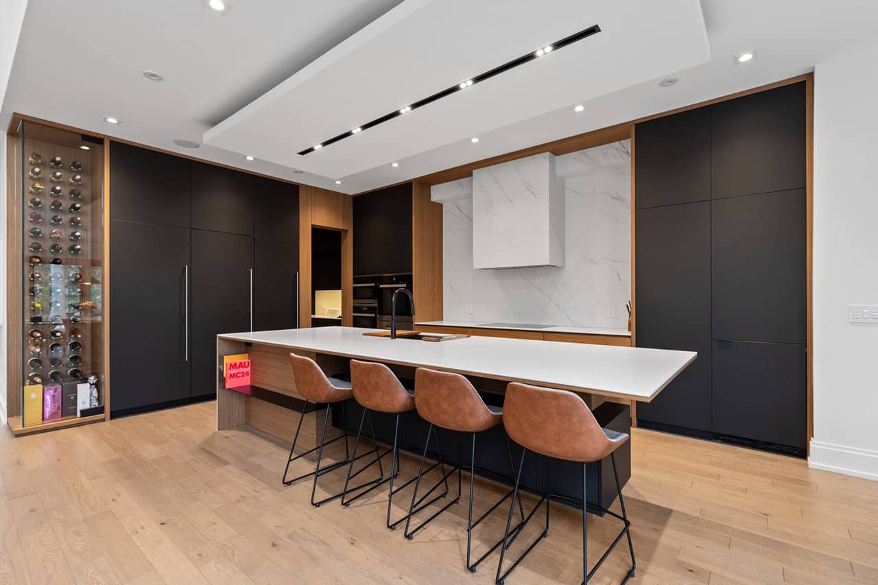 Fully equipped chef’s kitchen with wine display and kitchen island