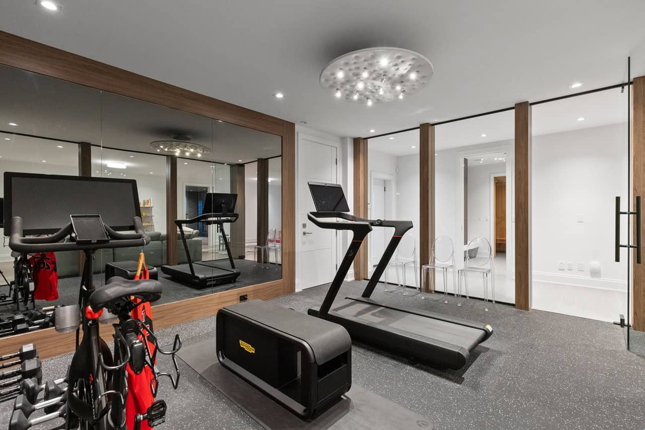 Other notable features on the lower level include the glass-enclosed gym with mirrored walls, built-in espresso station, extra bedroom, and three-piece ensuite with a glass steam shower.