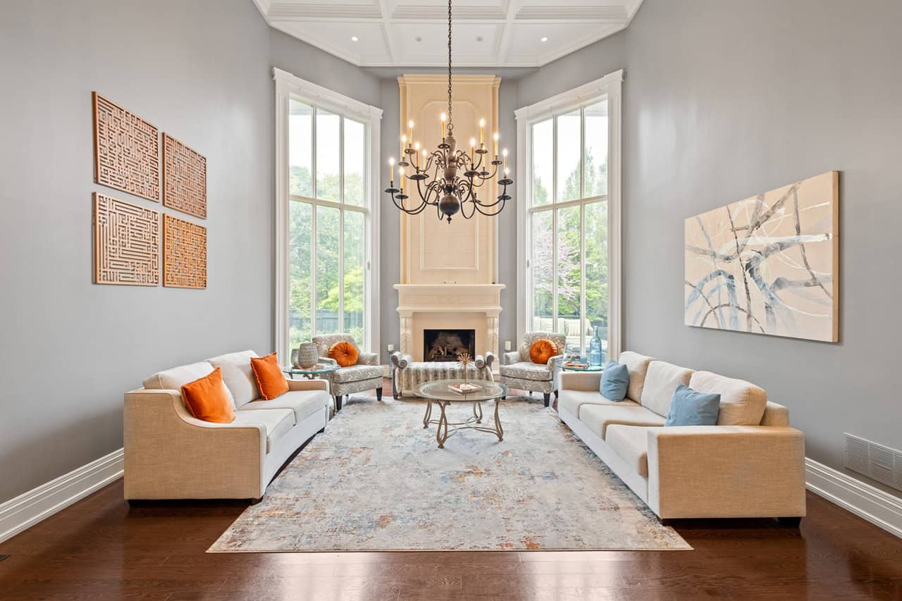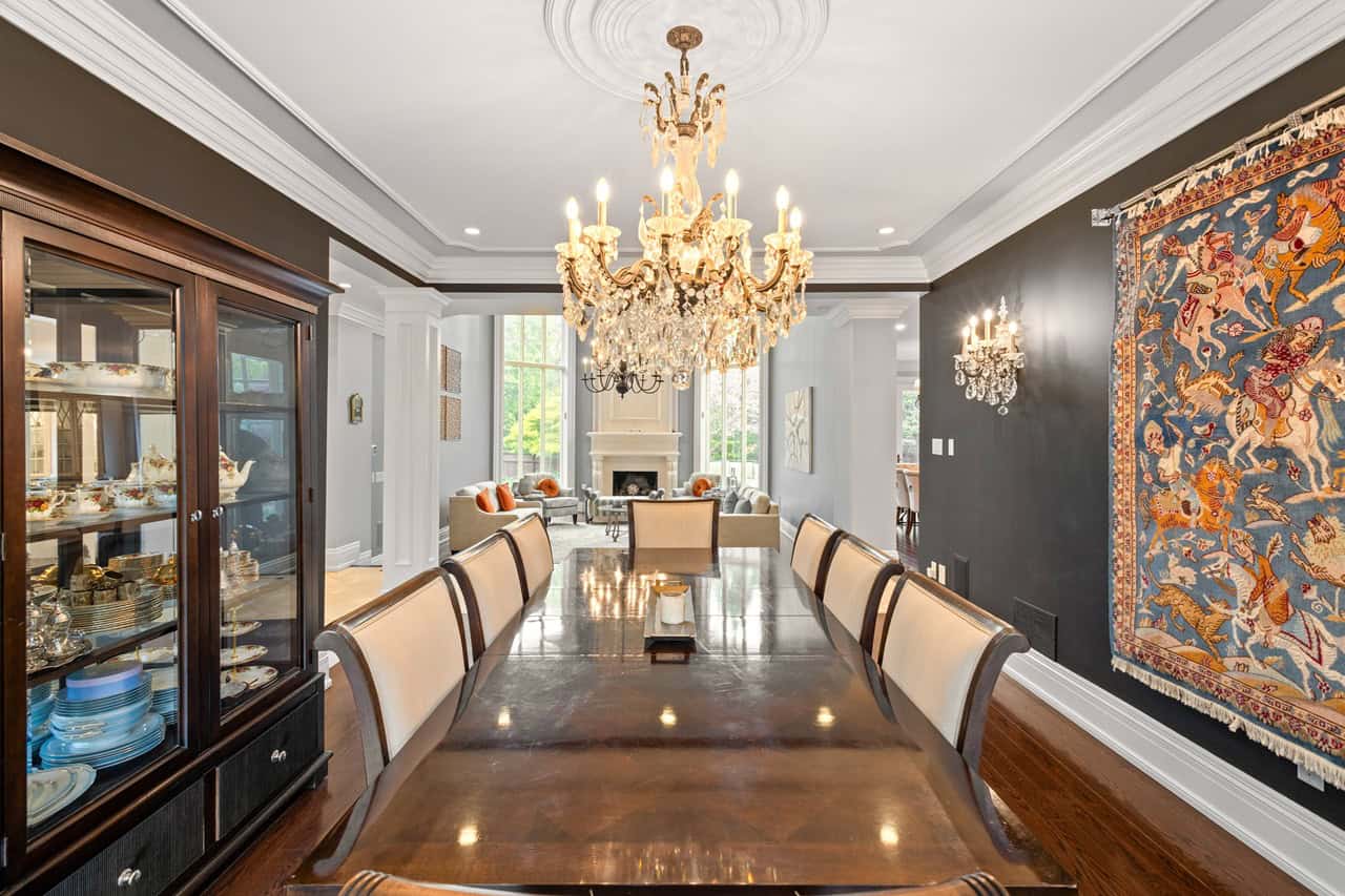 The home’s formal living room is adjacent to the lovely dining space, creating the perfect environment and ambiance for a sophisticated evening soirée, complimented by the floor-to-ceiling gas fireplace.