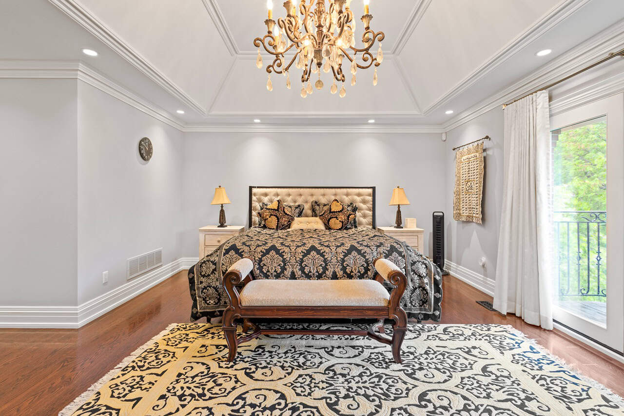 The estate’s gorgeous design is taken to a new level on the upper floor, home to five beautifully appointed bedrooms, including the showstopping primary suite. Designed with comfort and sophistication in mind, the suite impresses with soaring 11-foot cathedral ceilings, a charming French-inspired five-piece ensuite, and a custom-designed walk-in closet. The suite also opens up to the private terrace, offering a beautiful view and fresh air at a moment’s notice.