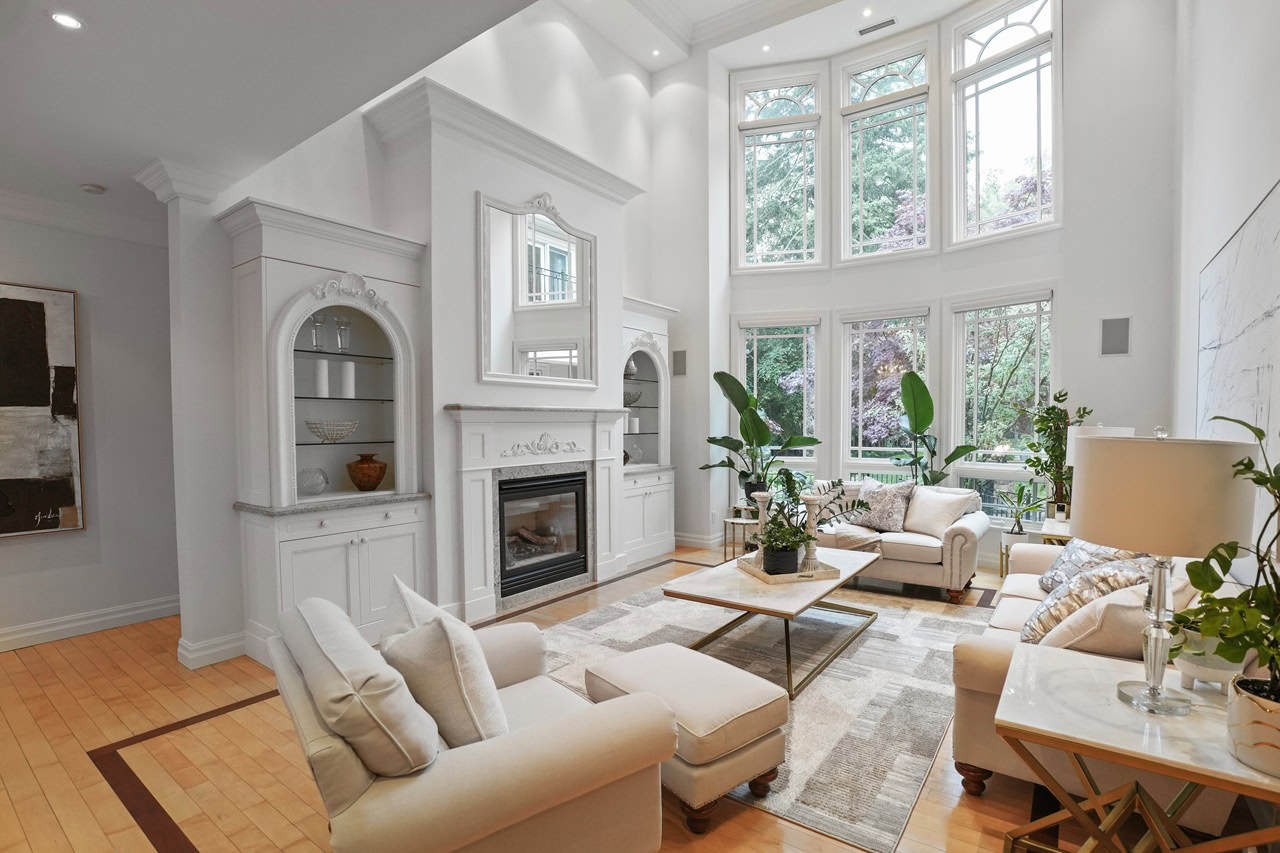 The home impresses even further with its refined interior design and grand proportions — beginning with its sun-filled foyer, which leads to a dramatic family room with soaring ceilings, custom built-ins, and breathtaking floor-to-ceiling windows.