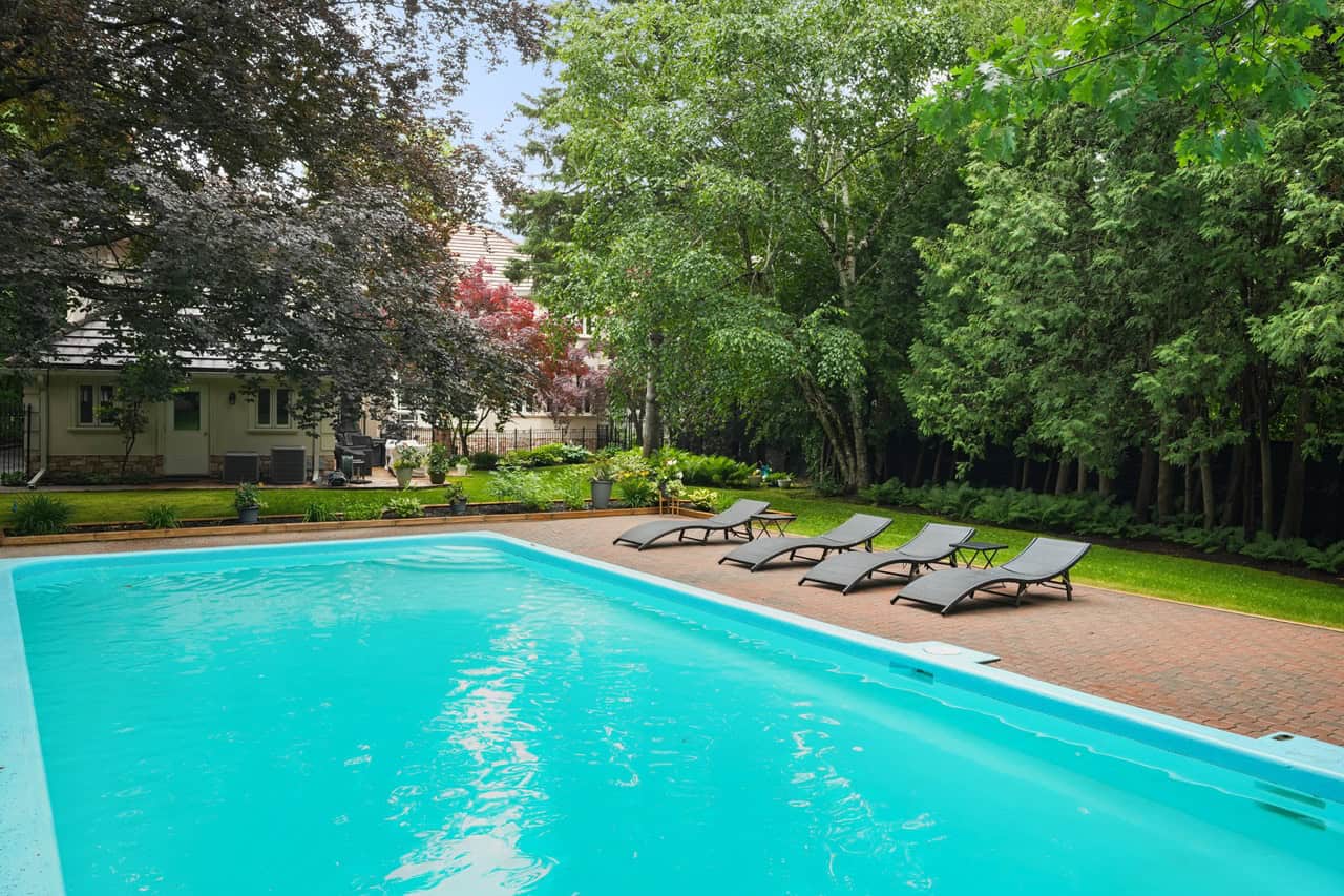 Step out to the beautifully landscaped yard, where the spacious patio shaded by mature trees is the perfect place to chat with guests or unwind after a long day – and swim the hot summer days away with the yard’s centrepiece, a resort-style in-ground pool.