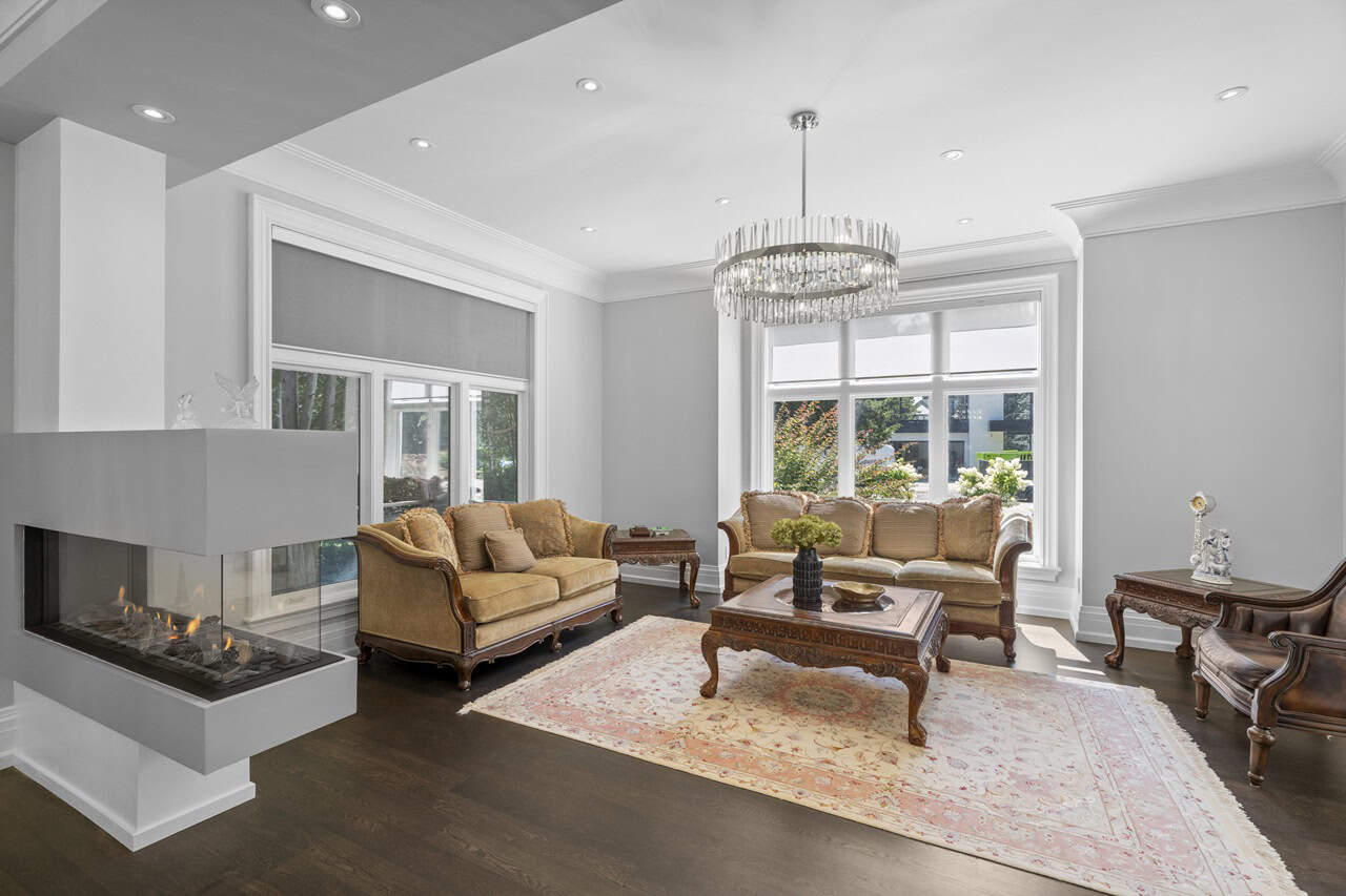 Beautiful design and full architectural precision are on full display in the family room, noteworthy for its three-sided gas fireplace and 16-foot ceilings.