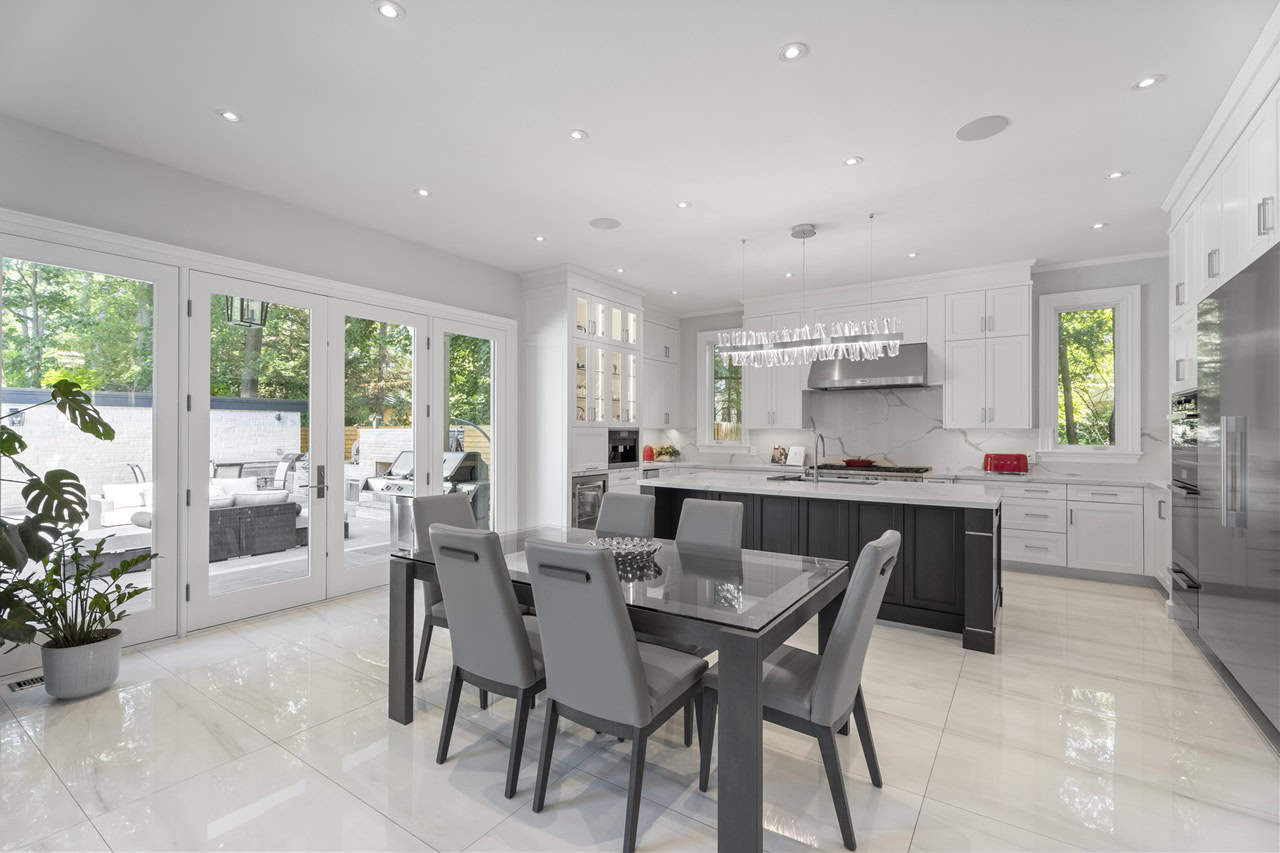 Through the Butler’s servery, step into the refined gourmet kitchen outfitted with Braam’s cabinetry, Miele appliances, a centre island with sleek porcelain counters, and a breakfast area that opens up to the covered stone patio, perfect for enjoying a meal outside.