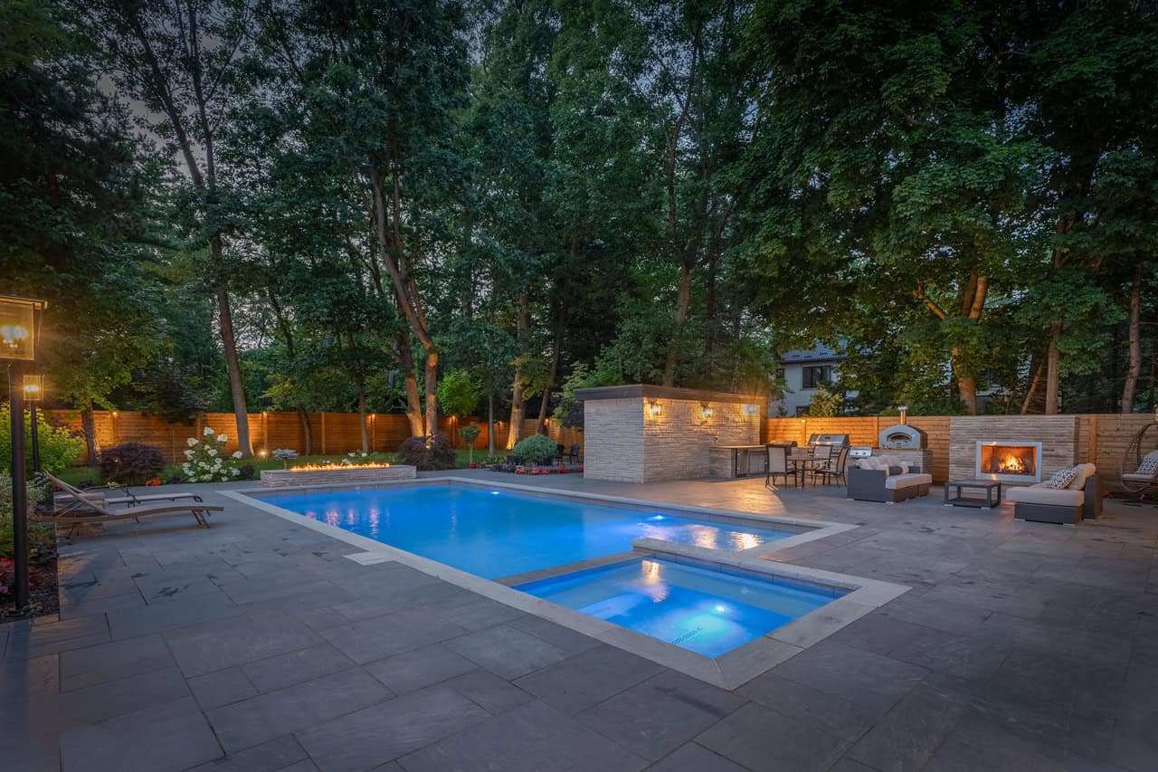 The family room’s floor-to-ceiling windows offer a lovely view of the recently completed backyard oasis. Step outside to enjoy the outdoor Napoleon kitchen, comfortable seating next to a gas fireplace, and an in-ground pool complete with a hot tub on one side and a linear fireplace on the other for ultimate relaxation in the water.