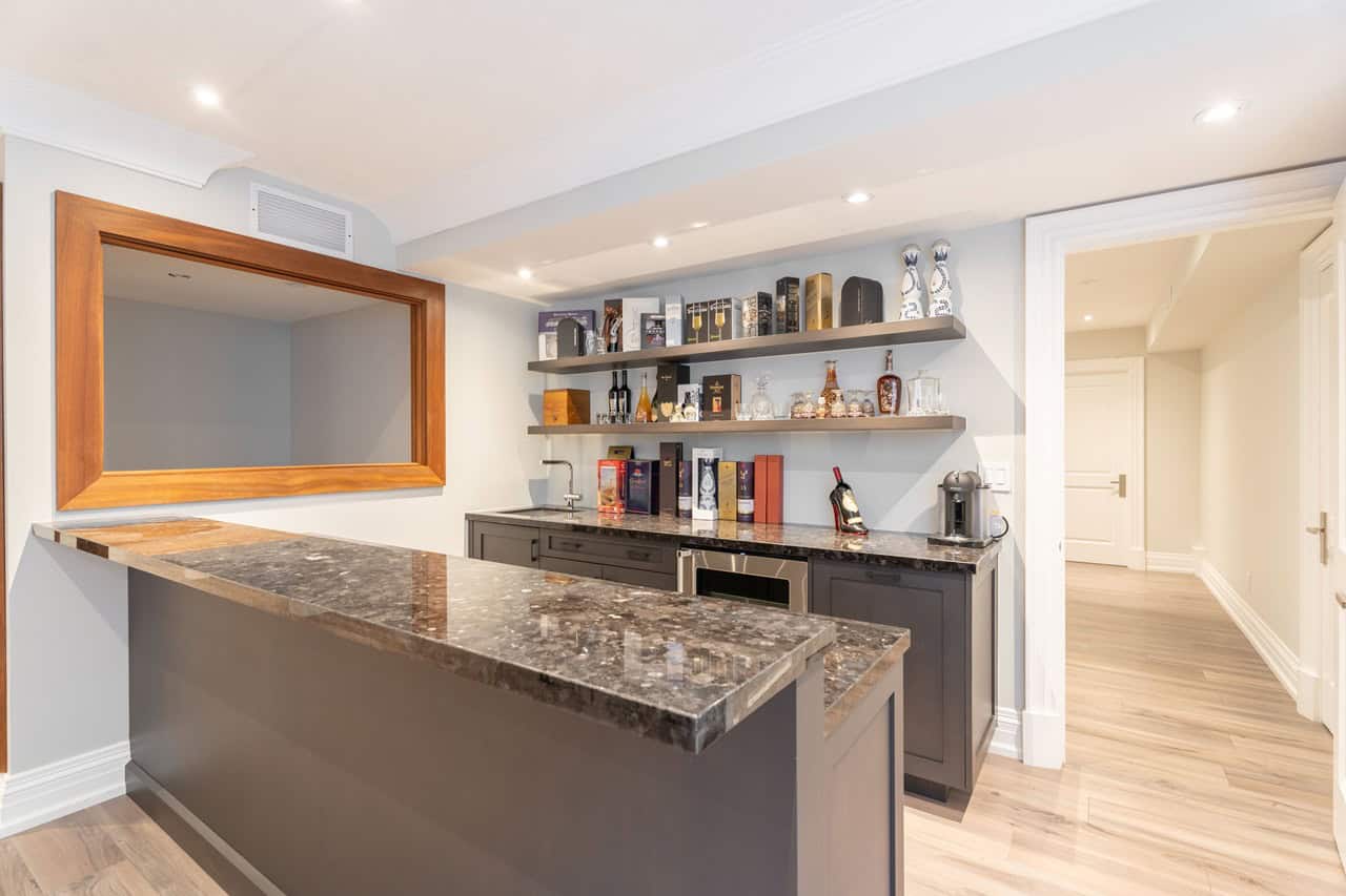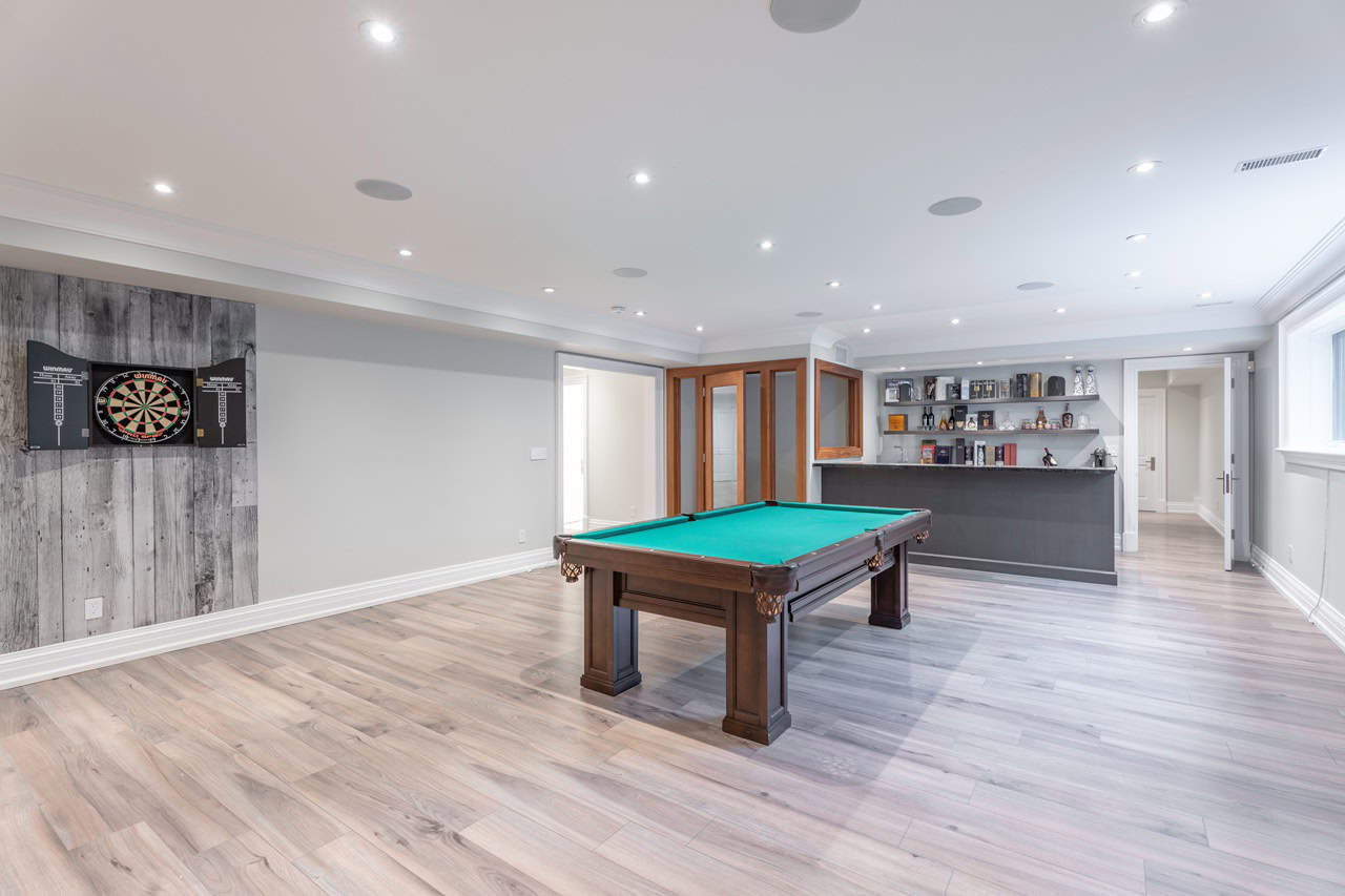There’s more recreation and relaxation to be found downstairs in the spacious basement complete with its own guest suite, a gym with dry sauna, radiant heated floors throughout, a wet bar with a wine cellar, and a large rec room perfect for playing billiards, darts and more.