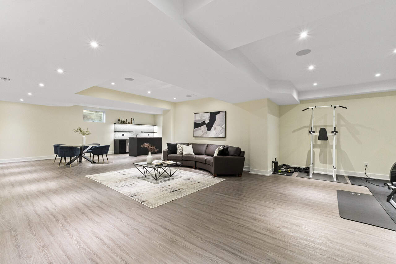 Step down into the finished lower level well-suited for entertaining. This floor boasts 9-foot ceilings, a full wet bar, expansive recreation room, guest suite with ensuite, and a flexible room ideal for turning into a home theatre or private gym.