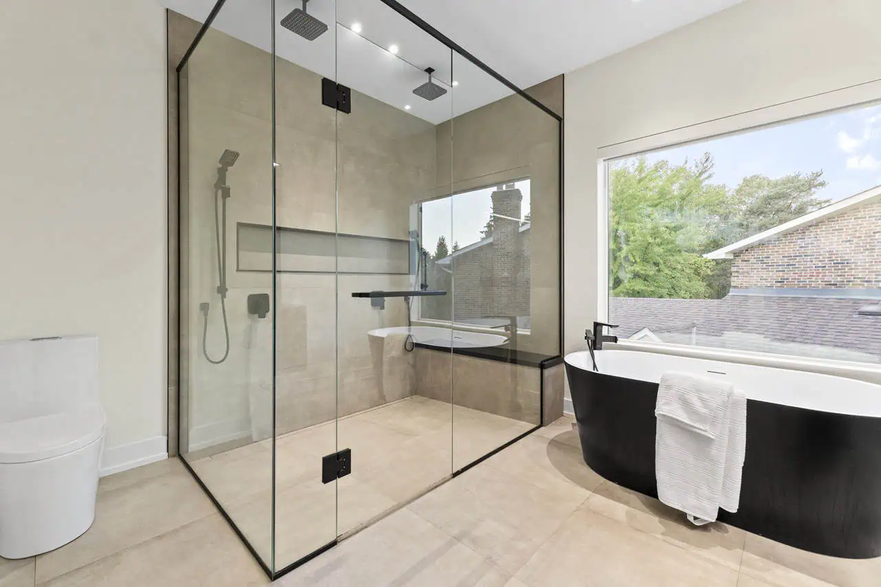 Above, the luxurious primary suite is a private retreat with dual walk-in closets and a spa-like ensuite, notable for its freestanding tub and aesthetic glass shower.