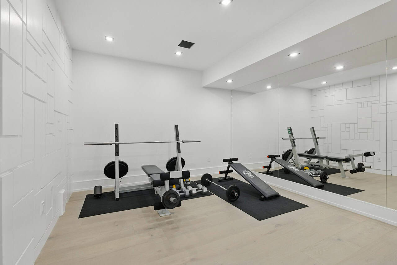 Take the elevator down to the finished lower level, a true entertainer’s dream with all manner of amenities. Here you’ll find a soundproof theatre room with a state-of-the-art home cinema system, two full wet bars, and a mirror-walled gym, with heated hardwood floors throughout.