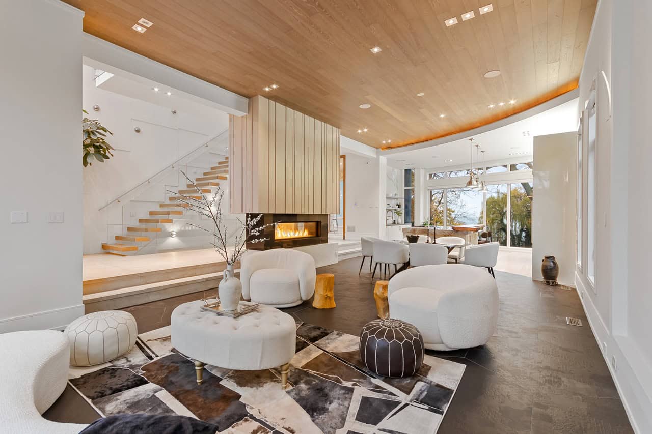 Beautiful design details are showcased throughout more than 6,200 sq. ft. of total living space. It starts on the main level, where warm wood ceilings, gallery-like walls, and a sculptural double-sided fireplace create an atmosphere of refined sophistication.