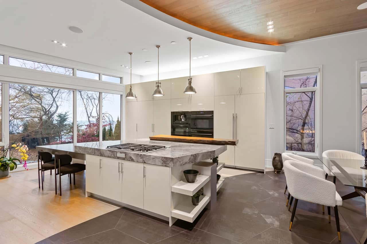 The gorgeous chef’s kitchen looks like something out of a cooking magazine, complete with high-end Wolf and Sub-Zero appliances, bespoke cabinetry, a custom backsplash, and a striking central island.