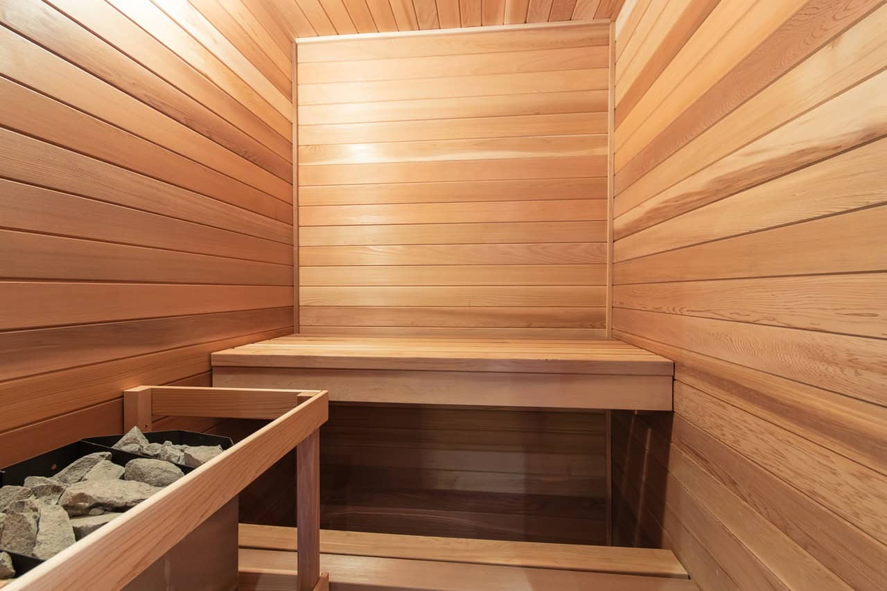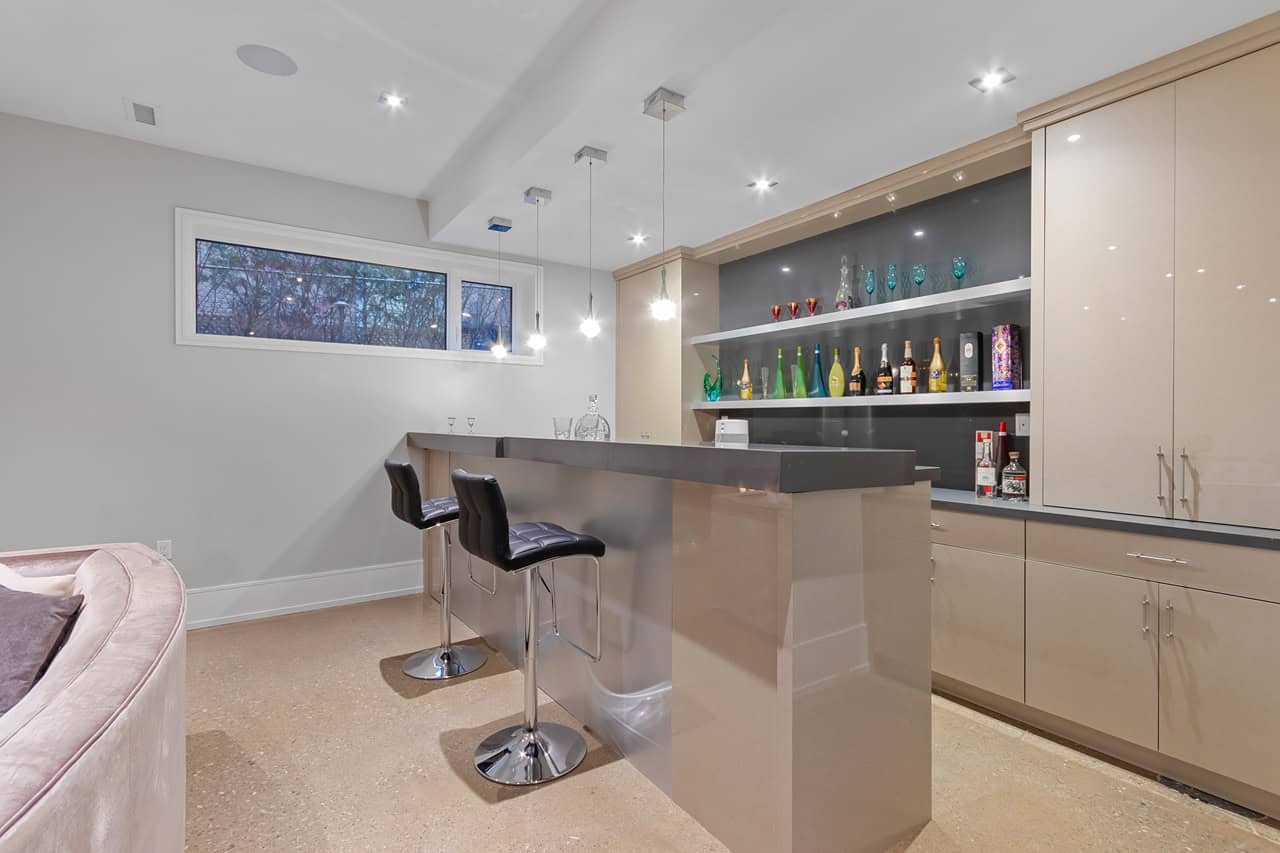Various resort-like amenities can be found on the lower level, including a recreation lounge, bar, gym, sauna, steam room, wine cellar, and additional guest suite, and a walkout that opens seamlessly to the tiered backyard.