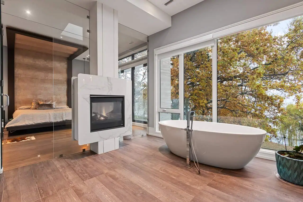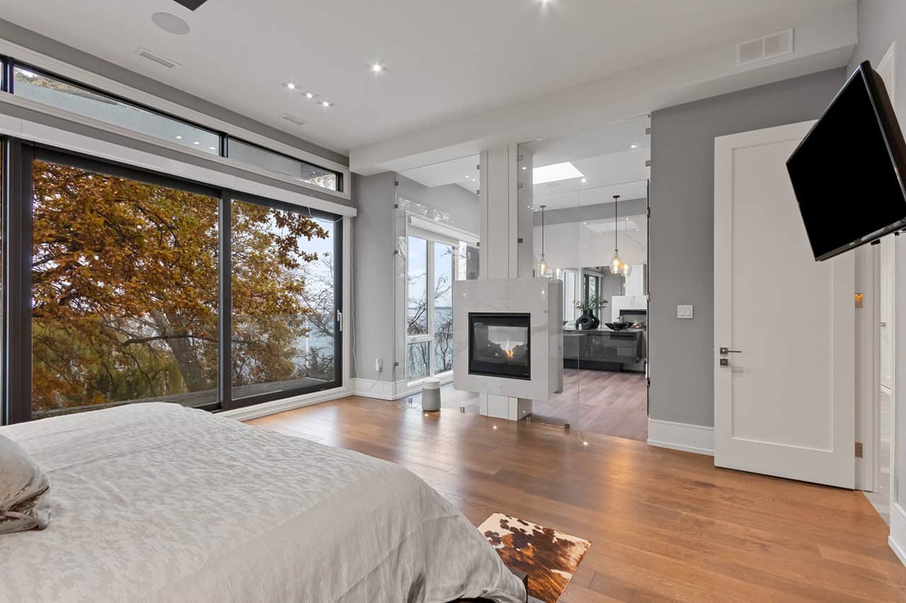 The luxurious primary suite faces the lake for gorgeous views that can be enjoyed anytime on the private balcony. The suite comes complete with a boutique dressing room and a double-sided fireplace that connects with the spa-calibre ensuite – enjoy never-ending warmth with the heated floors and take a soak in the freestanding tub overlooking the water.