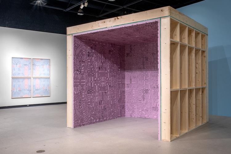 The Room is open on one side, exposing the box and welcoming the audience into its constructed space. The foam is incised with a repetitive pattern; the motifs, inspired by traditional Anishinaabe iconography, break the strictness of the industrial square form by introducing the personal and the poetic into architectural rigidity.