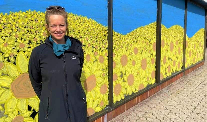 The artist got what she needed – “two warm days in a row” – and she was off and painting. She admitted that working outside on a ‘canvas’ that size attracts a lot of attention.