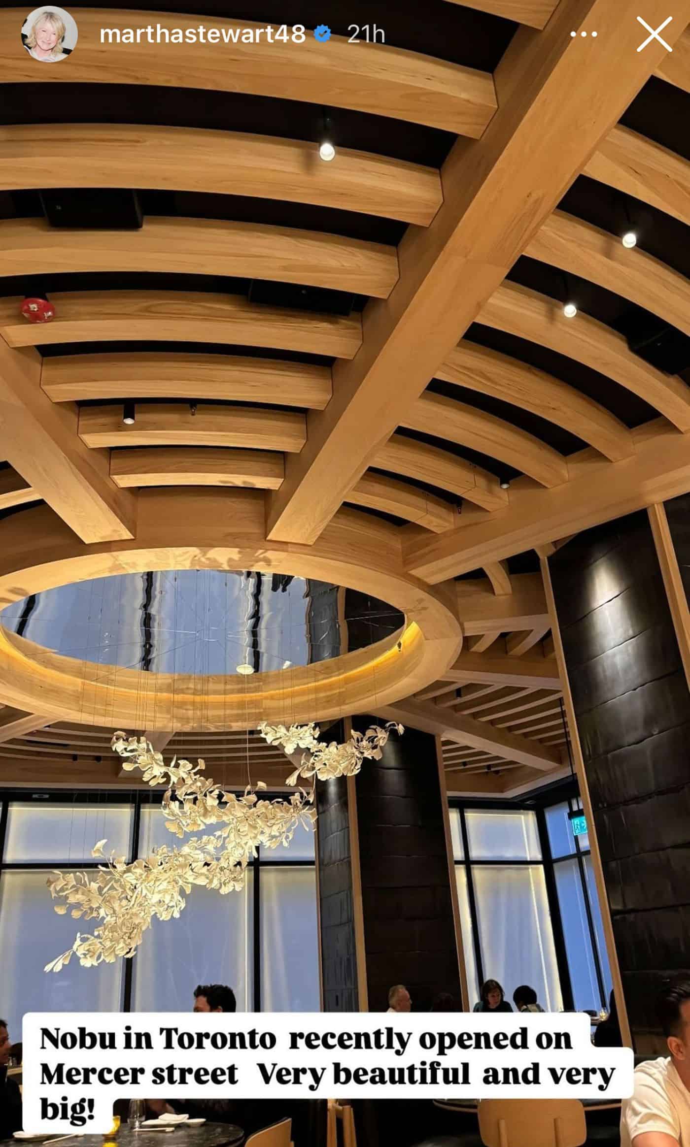 Martha Stewart visited Nobu in Toronto during the past week, praising the space as “very beautiful and very big” in a post to her Instagram story showing the restaurant’s lofty ceiling.