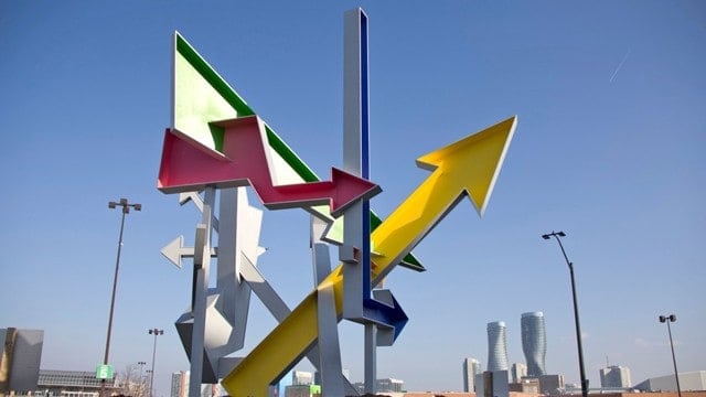 Renowned artist Michel de Broin is the mastermind behind Possibilities, an aluminum sculpture of eight colourful arrows. The arrows are inspired by the colours and shapes of oversized 1950s roadside signs – a reference to the future Mississauga’s development during the golden age of the automobile. The arrows also point to the future and the City’s vision for a new vibrant, pedestrian friendly, urban downtown.