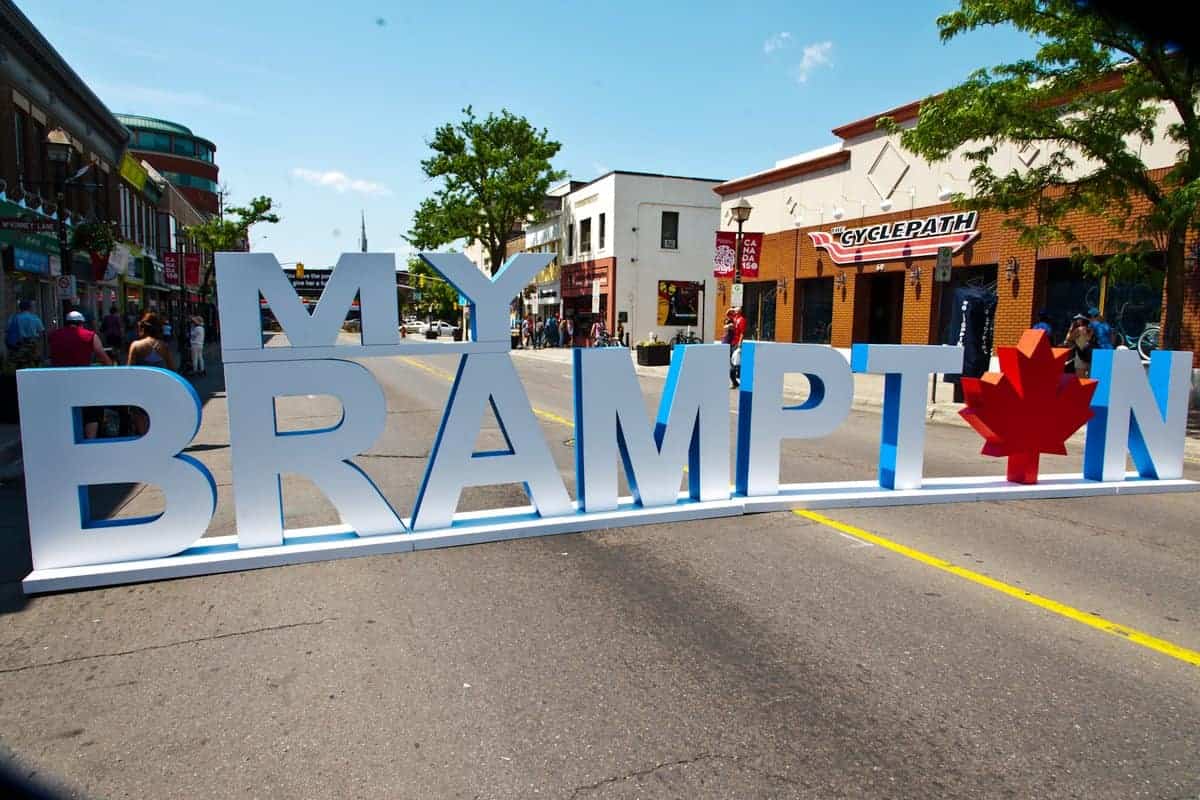 The sign features a maple leaf instead of the “O” in “Brampton” and spanned almost the width of Main Street at CeleBrampton.
