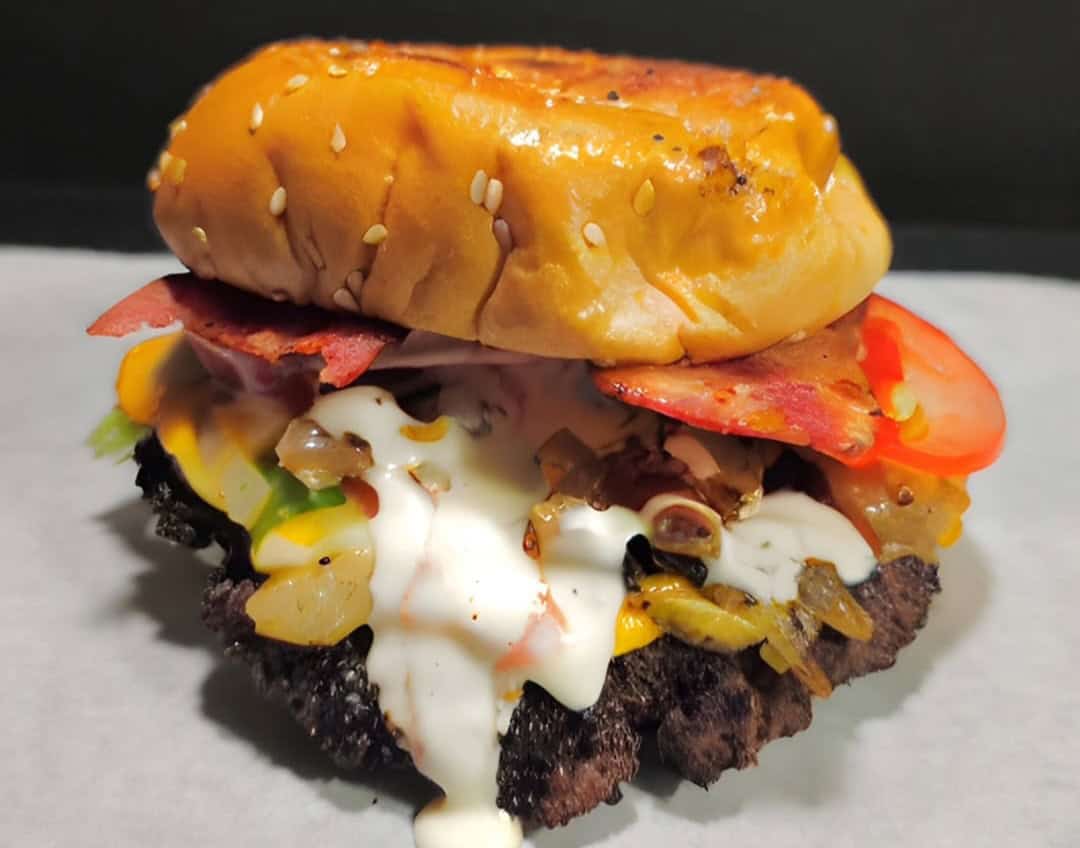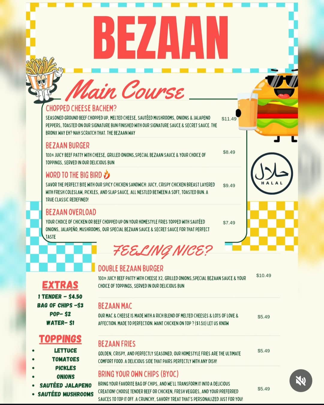 The menu features Halal-certified signature burgers and sandwiches like the “Chopped Cheese Bachem?,” made with seasoned ground beef, melted cheese, sautéed mushrooms, onions, jalapeños, and a secret sauce.
