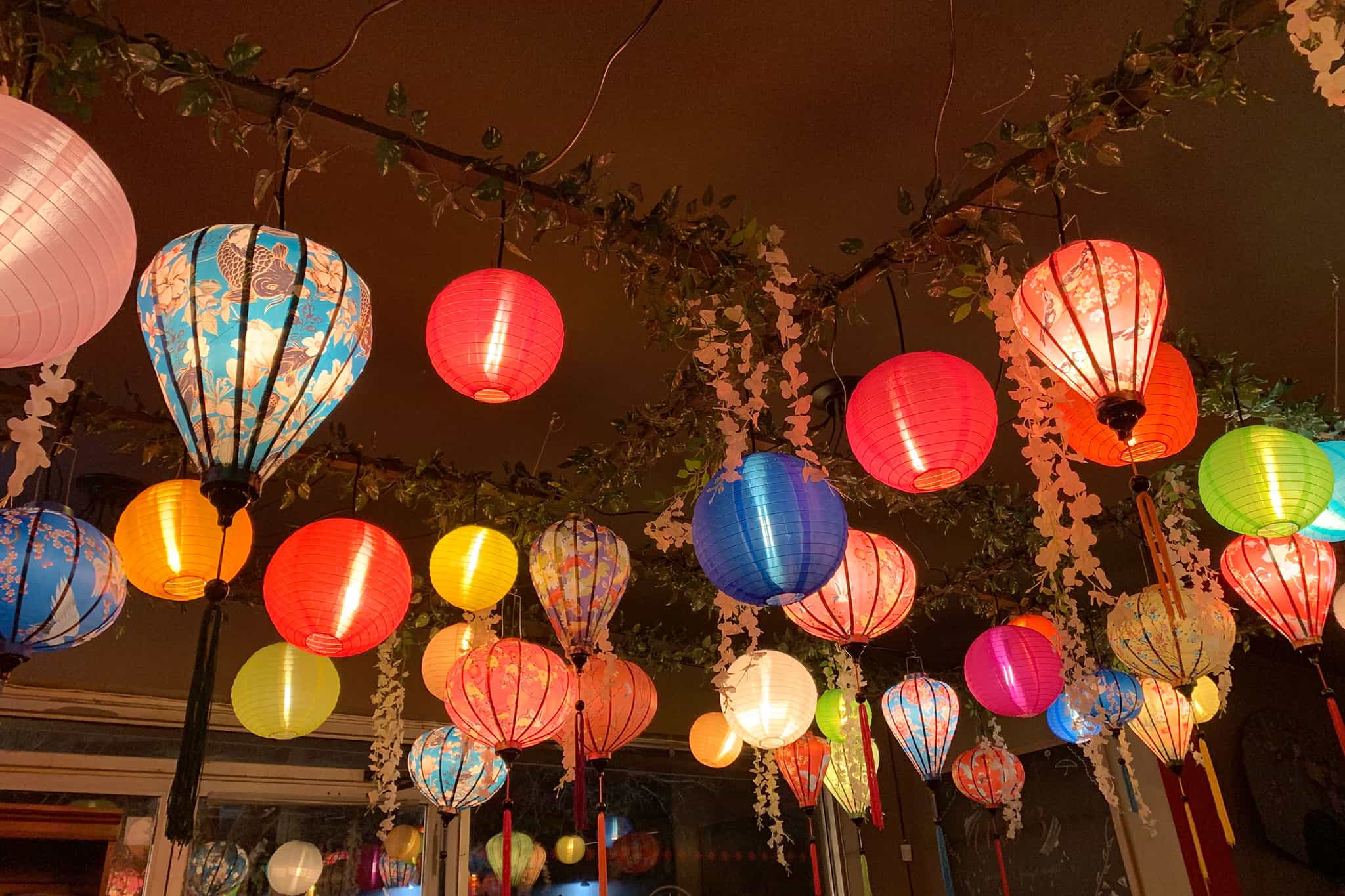 Dozens of lanterns illuminate Aisle 3 and a mural of rice fields, countryside and a dragon decorates one wall for a colourful atmosphere.