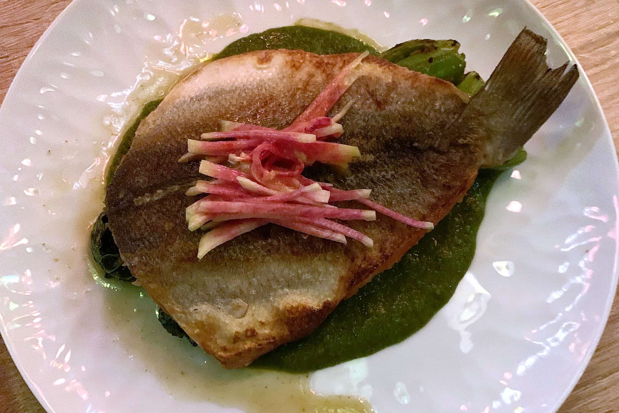 And the pan-seared seabass has a bright, green Muối ớt xanh sauce, gai lan, cilantro, and watermelon radish.