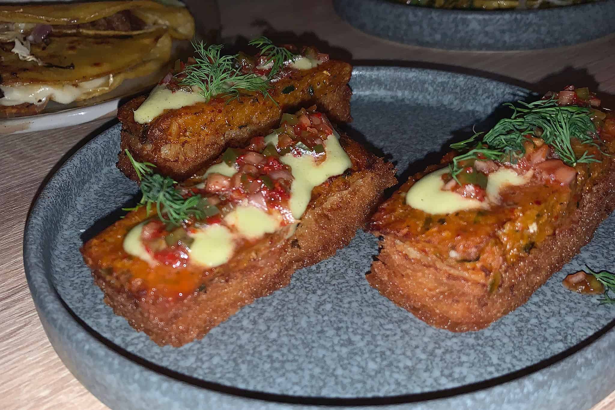 The snackable shrimp toast employs jalapeno relish, dill, scallion aioli, lemongrass and chilli.